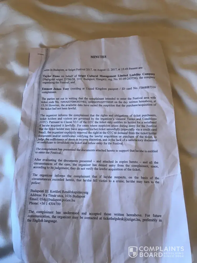 I am complaining about sziget festival. I had bought 2 day tickets on viagogo the night before, I turned up with the tickets, they scanned the QR codes and refused entry and said the tickets had been bought fraudulently and sold on. I have spoken to viagogo which were very unhelpful on the phone, I have spoken to my bank and they cannot issue a refund due to viagogo terms and conditions.