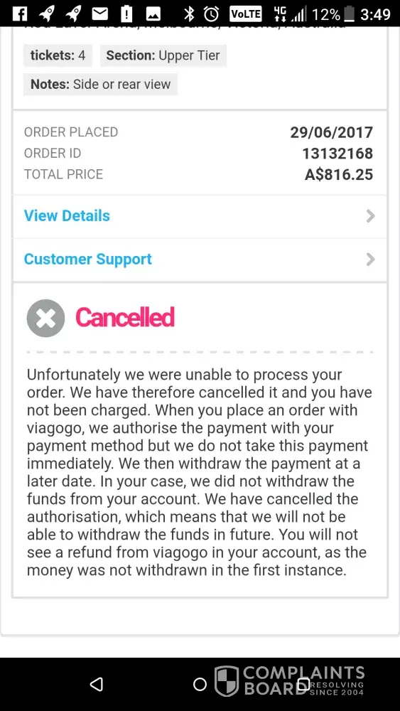 I was really excited when I purchased the tickets. A couple of days later, I noticed that the tickets had been cancelled by Viagogo without my knowledge.