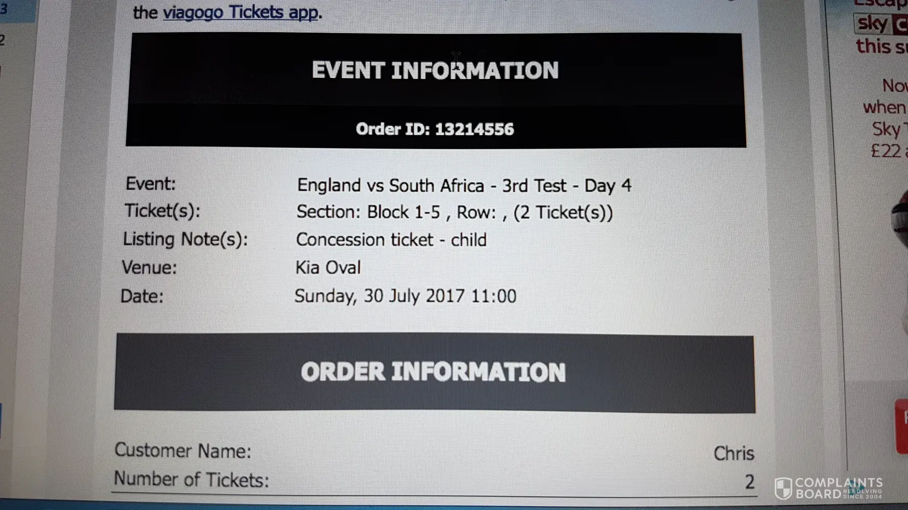 We purchased 2 ticket to England v South Africa 3rd Test Day 4 at Kia Oval as we will be in London. After we received the confirmation email we discovered that they were concession Child tickets. No where on the site when we booked said they were concession tickets, and at the price they cost they were adult tickets. We have emailed 3 times and tried all the phone numbers we can find, but we haven't been able to talk to anyone. We now have received our tickets and they are for under 16. I just don't think we could pass for that age.