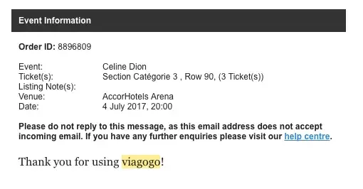 I recently bought three tickets to see Celine Dion with my family on 4th July at AccorHotels Arena in Paris (Order ID 8896809).