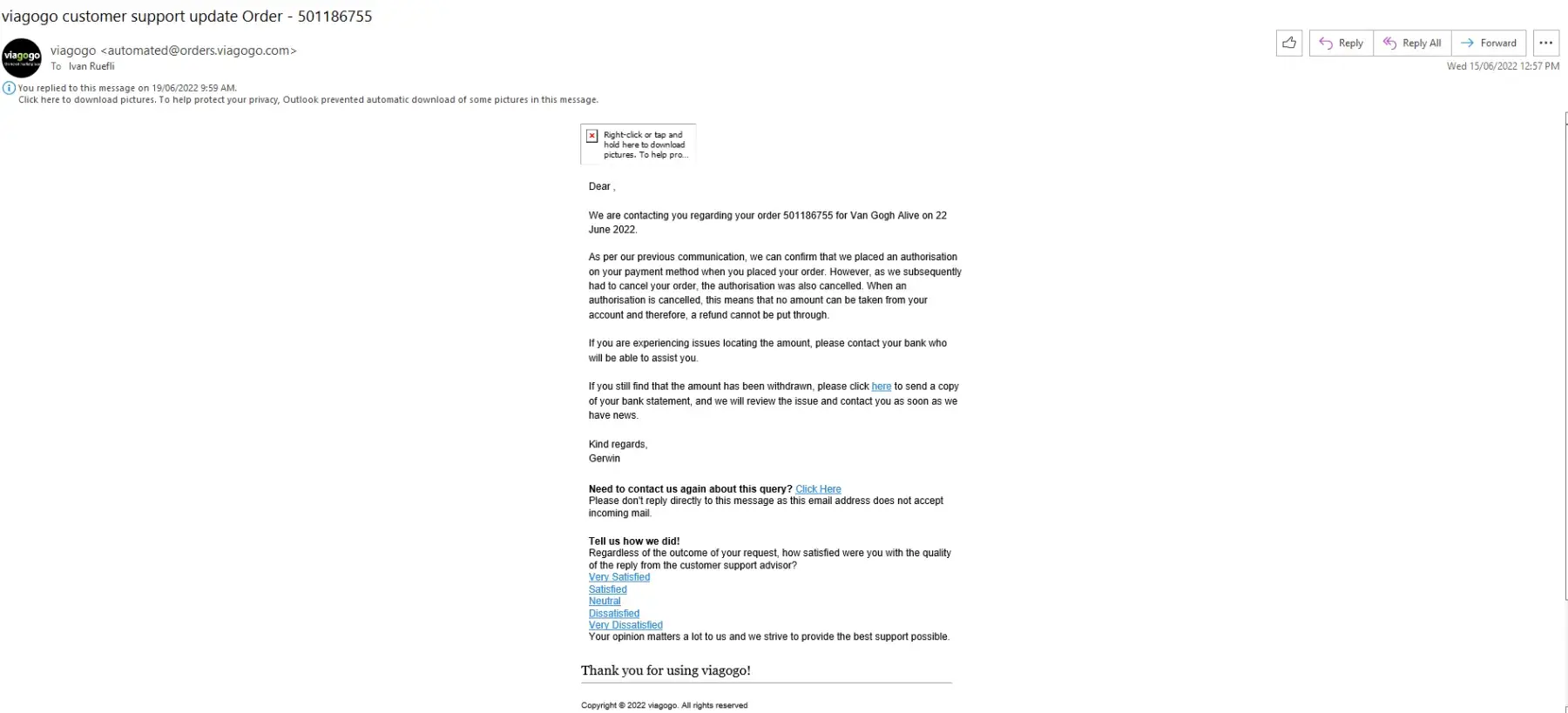 2. Received a message from Viagogo at 12:57 AWST on 15/6 to say you placed an authorisation but subsequently canceled the order