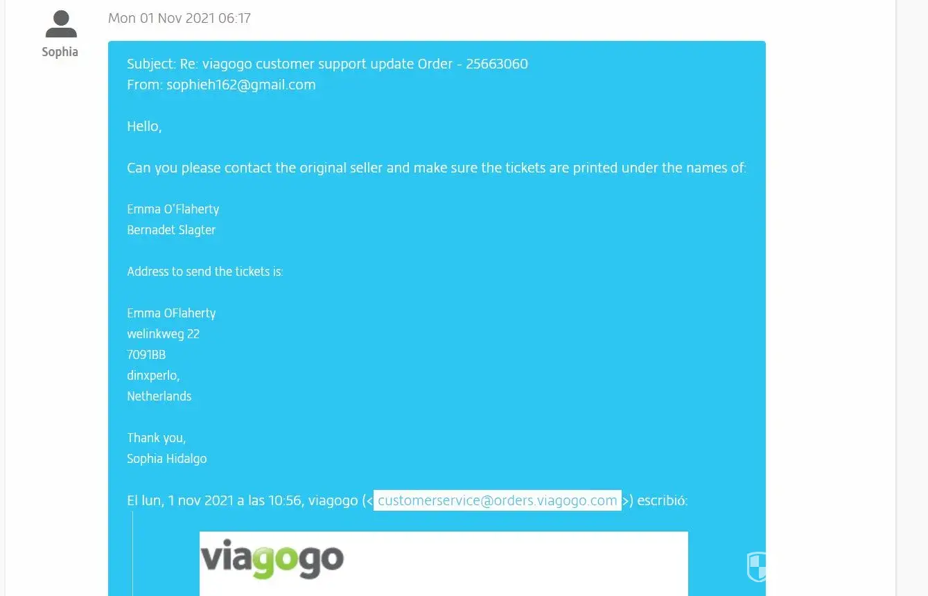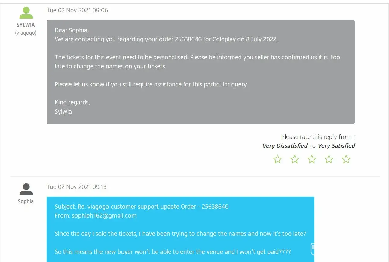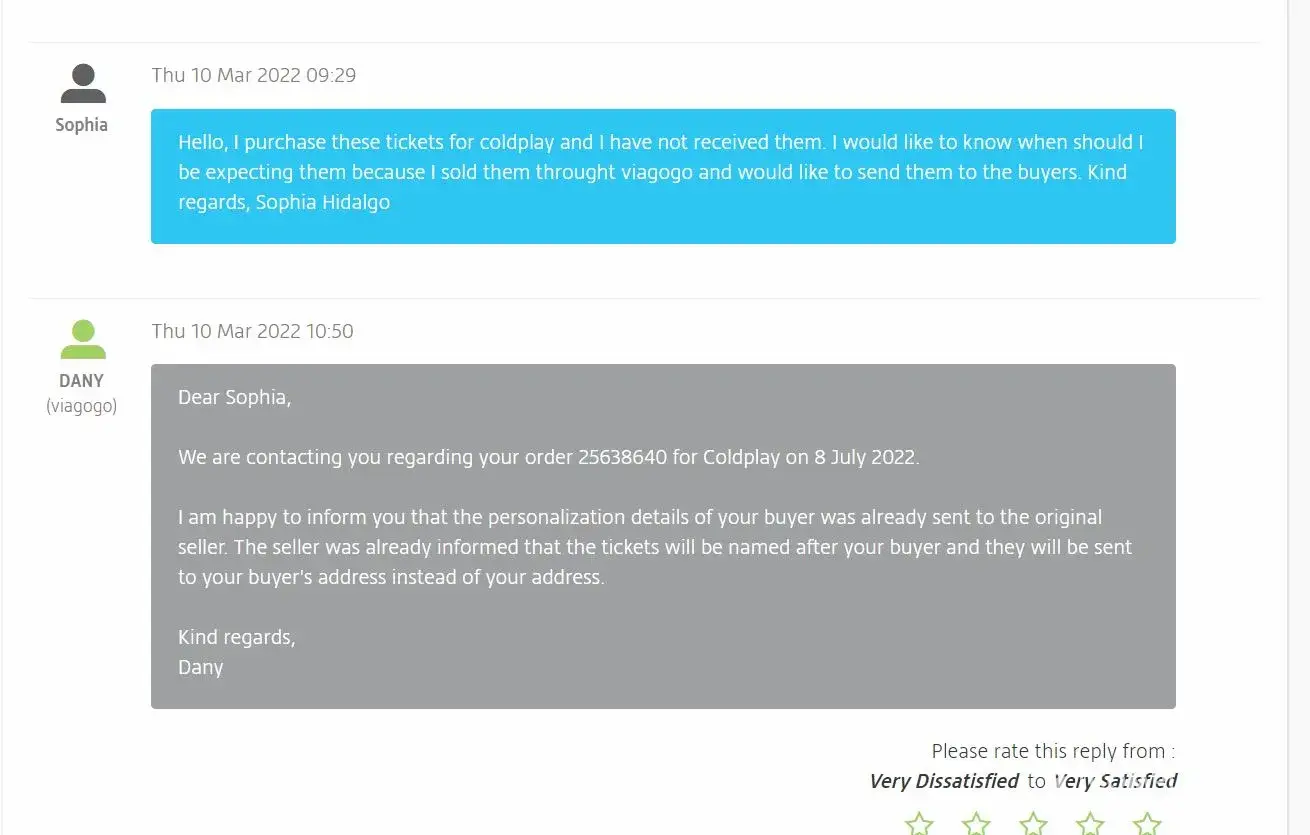 Since then, I have been calling and emailing several times Viagogo to make sure the names on the tickets were changed to my buyer's names. And I received confirmation from Viagogo that they forwarded this details to my seller. Viagogo did not want to provide me with my seller's contact information, so I could only request the changes to Viagogo so Viagogo could contact my seller.