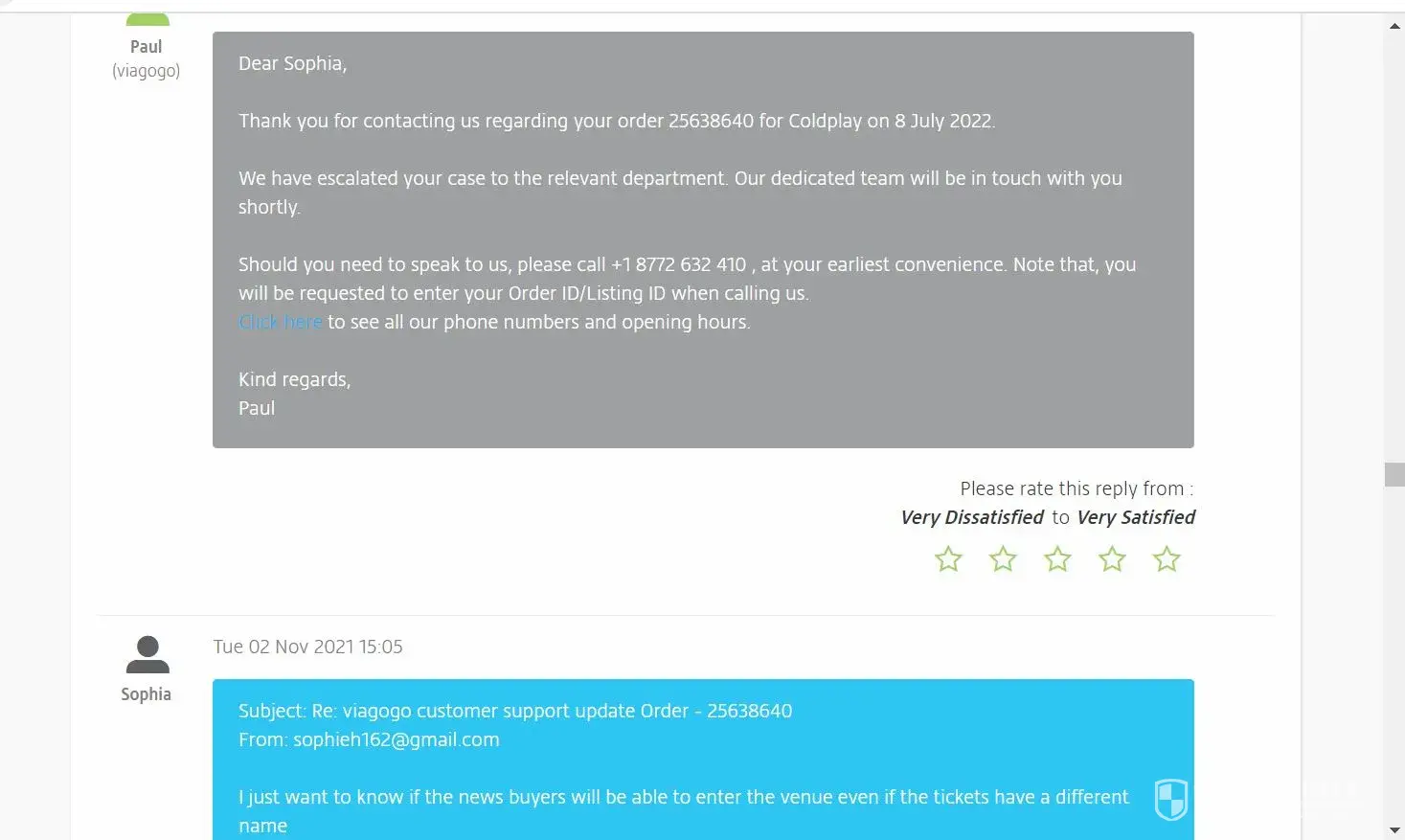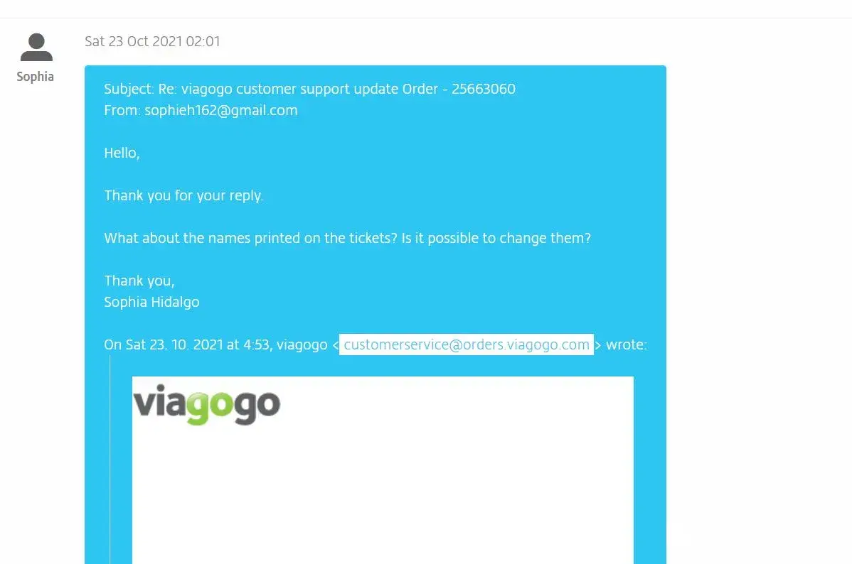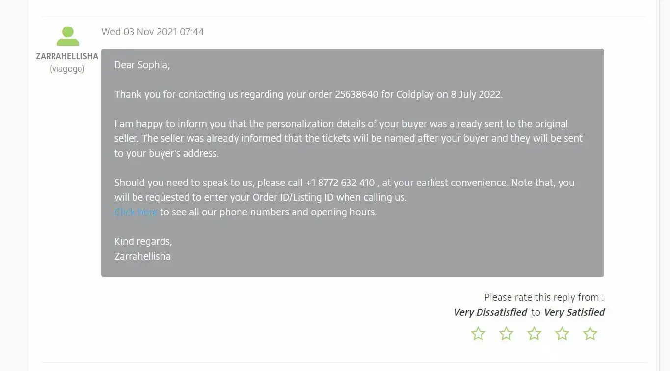 Since then, I have been calling and emailing several times Viagogo to make sure the names on the tickets were changed to my buyer's names. And I received confirmation from Viagogo that they forwarded this details to my seller. Viagogo did not want to provide me with my seller's contact information, so I could only request the changes to Viagogo so Viagogo could contact my seller.