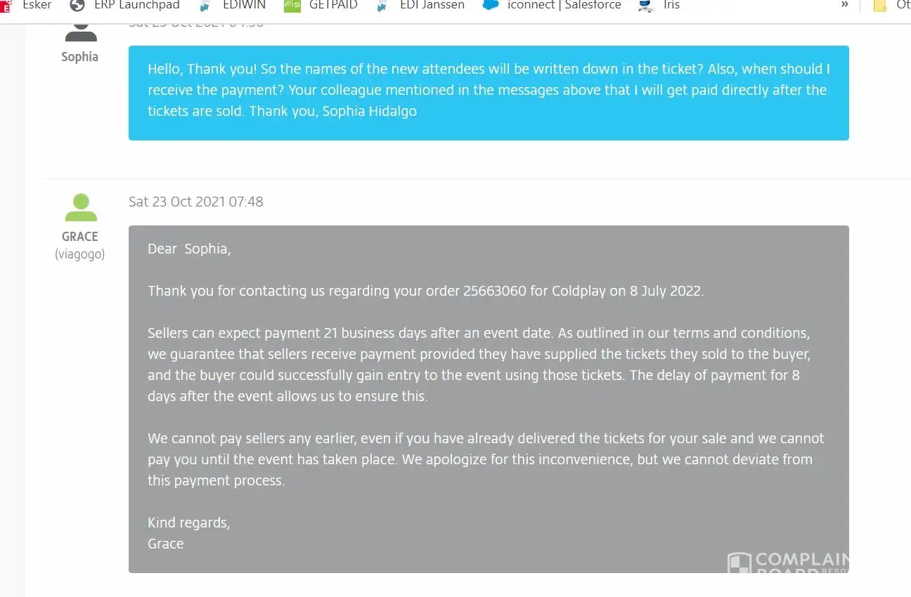 I sold a VIP ticket to the Coldplay concert in Berlin on July 12, 2022 through the Viagogo site. Because it was a VIP ticket, I needed the buyer's name and contact information, which I received. Because of this, I was able to confirm with the buyer that he did attend the concert. Now, Viagogo won't pay me for the sale. I've emailed them several times and left messages on my account but they stopped replying. They are now completely ignoring me. I'm owed 400 Euros.