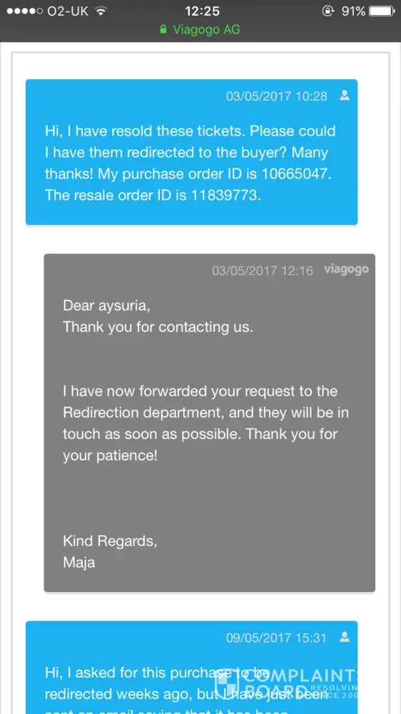 Absolutely outrageous customer service. I bought 2 tickets on viagogo. Tried to resell them and used their "one click listing" service. These were sold and I emailed them asking to redirect the tickets to the new buyer - they agreed to do so.