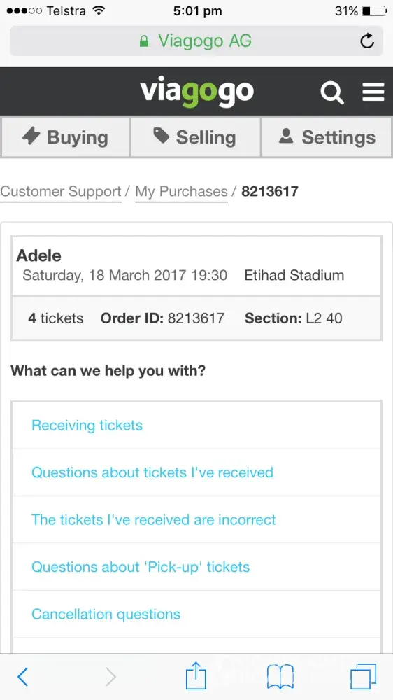 I bought four tickets to the adel concert melbourne when I got there we were refused entry and told that the tickets were no good. My order number is 821367 jodie taylor I had travelled four hours to atten this concert and was very upset to learn that this was the case. Please contact me with a solution we have already missed the concert and reluctant to use this site again