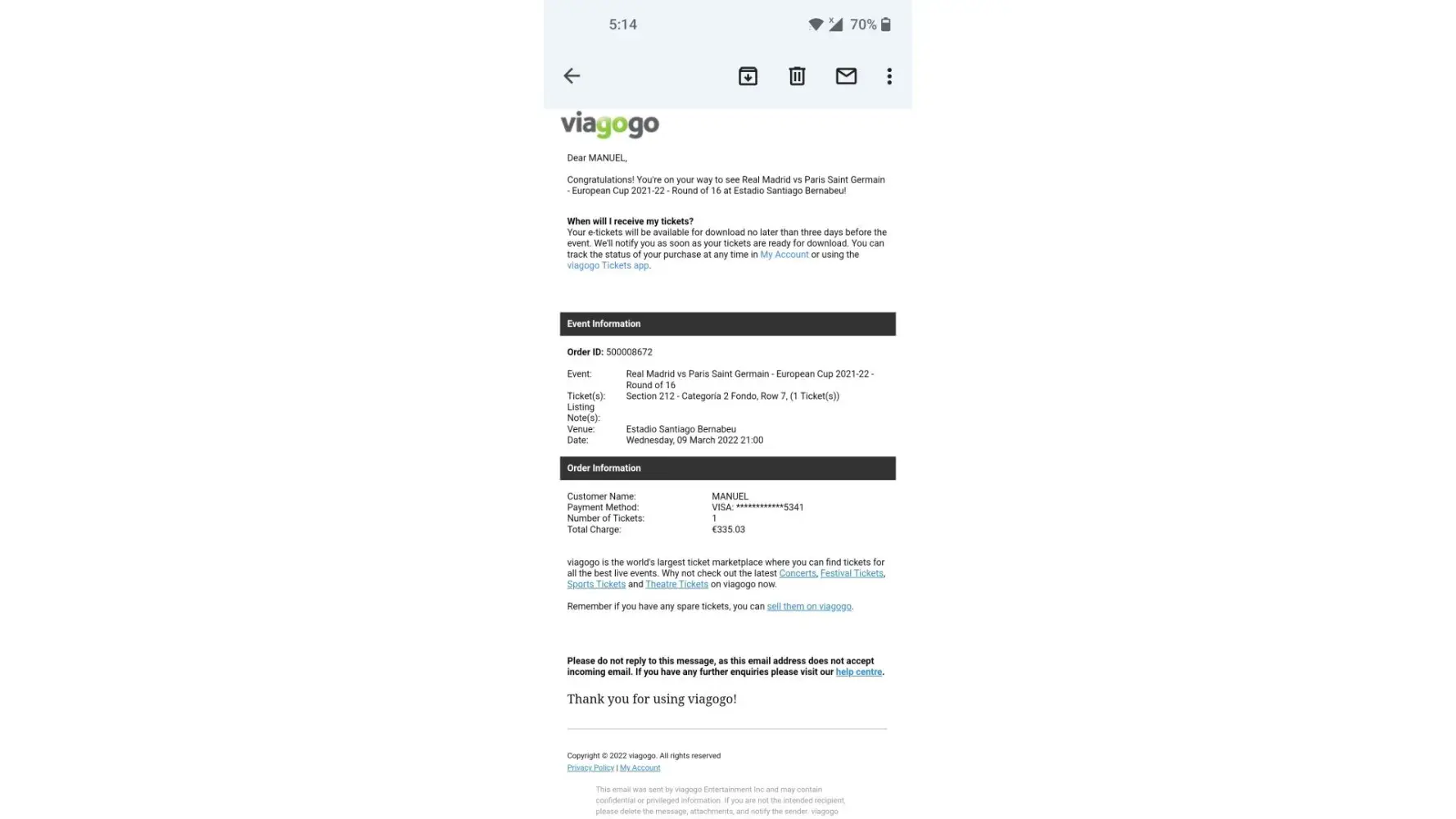 I also asked for more information about the ticket like the face value of the ticket, the row the seat is in and the seat number since the only thing mentioned was the section of the ticket. They also still haven't answered my question about that. I also told them that I need the information so I can check with the official ticket seller if I will be allowed or refused entry to the venue because living in Greece that also means booking flights and accomodation accordingly which in the end means that I am bound to lose a lot more money than just the 340,40 Euro that the ticket for the sporting event cost me.
