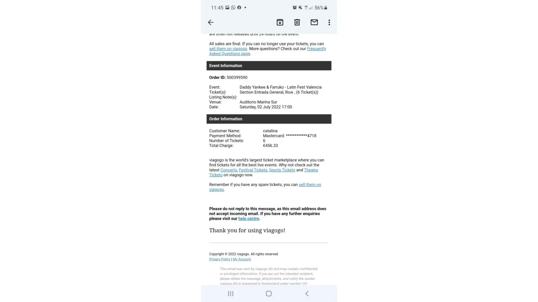 On April 19 my girlfriend and I have bought through Viagogo's website 6 tickets for the "Latin Fest" concert that will take place in Valencia on July 2, at the total price of €456,33.