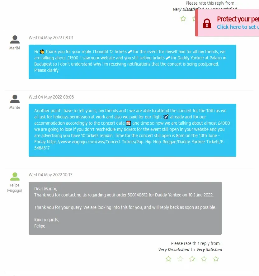 We got in touch then with Viagogo several times, explaining them that we had decided to purchase those tickets because of Daddy Yankee's presence, and that their website did misleading advertising - but they have rejected all our arguments, saying that we couldn't get a refund and that we could rather try to resell the tickets on their platforms.