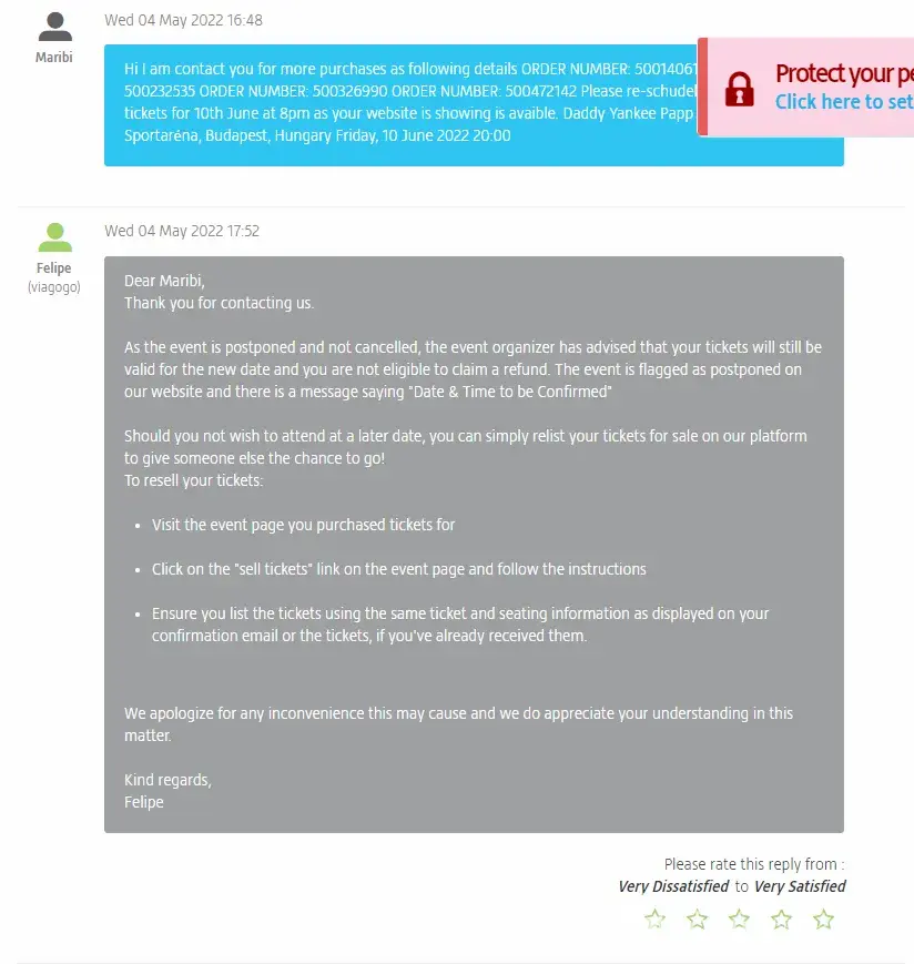 for three days I have been trying to solve the change of my tickets for the concert that is still open on the Viagogo website, I am talking by phone and email with five different people and none of them solve the problem. I am not even asking for my tickets to be refunded, I am requesting that I change the tickets to the event that is still open. The truth is how it is possible that they continue to sell tickets for a concert that is postponed.