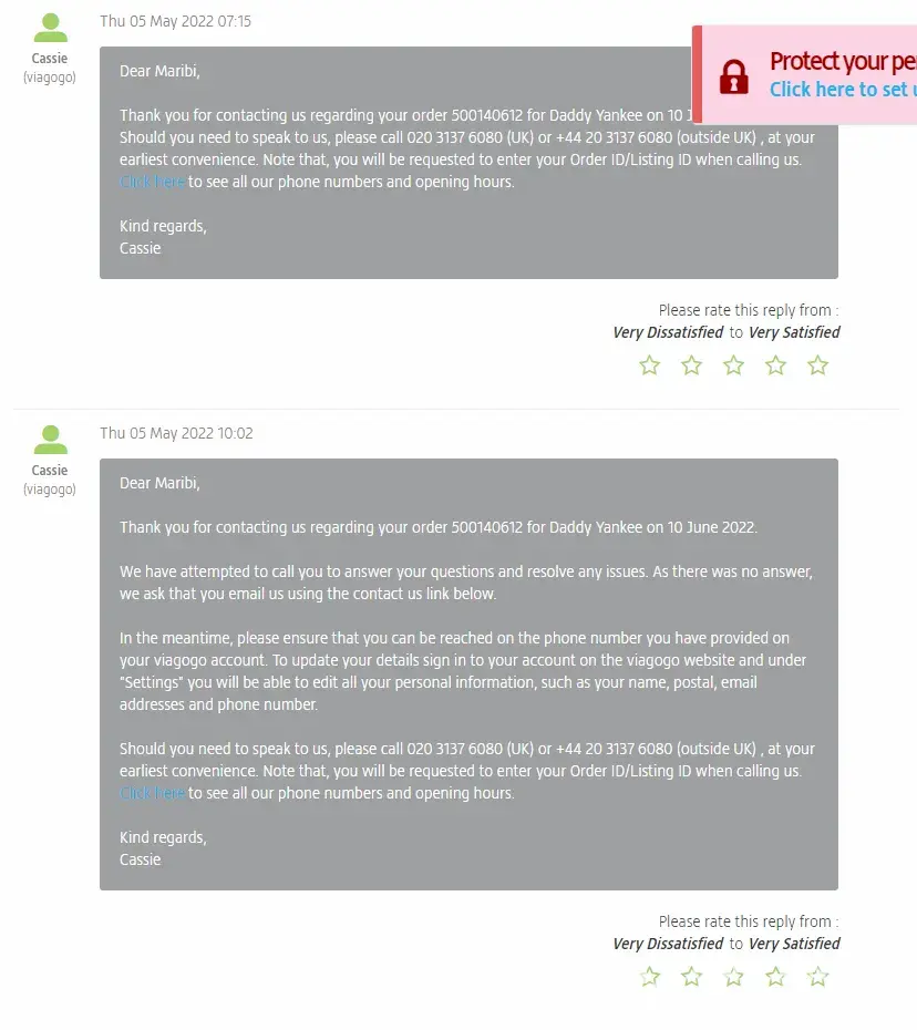 So I googled Viagogo.com and came accross many negative reviews, many news articles about their practices and how in some country the court ruled that their activities are ILLEGAL. I immidiately reached out to them to cancel my order and to give me a full refund. To this day April 17th 2022 they refuse when I send them messages on the "my messages " page. All the emails I've sent them are ignored. They also have claimed that they have called me when I had my phone right next to me and it didn't even ring.