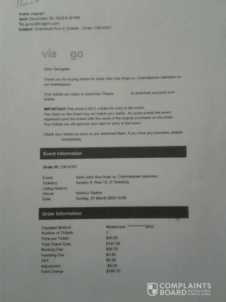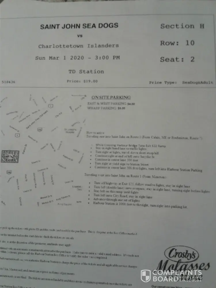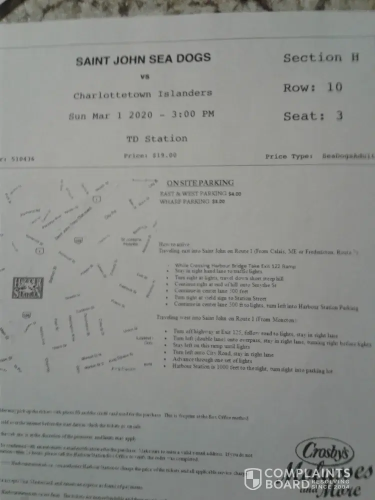 My name is Georgette Roy of Fredericton, N.B. On December 30, 2019, I went on the Internet to purchase 3 tickets to a hockey game in Saint John, N.B., which is about 1 hour from my home. I believed I was on the site from Saint John to purchase the tickets, I had no idea the price of hockey tickets. I was puchasing this for my son and his children. I wa...