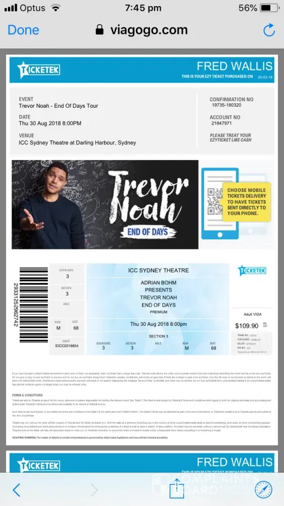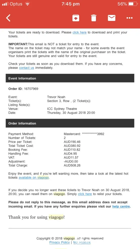 I was charged $509 for 2 tickets to Trevor Noah and then the ticket price on our receipt said $109. I was also charged a $110 booking fee. This is unacceptable and I will make sure no one I know buys off this if this the case. If not the booking free and handing and other fees that have nothing to do with the service should not be refunded, then the ticket price difference should be of $220. This is pure theft.