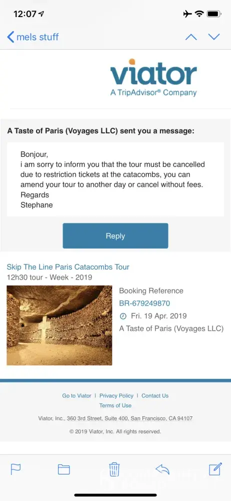 I received an email from Viator telling me my pre paid tickets to the catacombs for the 19April2019 has been cancelled. I was given the option to get a FULL REFUND. Booking number BR-[protected]
