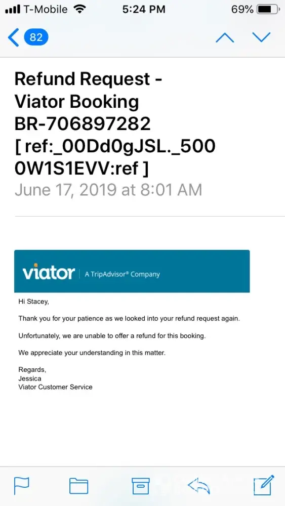 In a very strong message to Viator, I say, "an absolute shameful way to treat a client who has previously had faith in their business, which so boldly boasts of being …… "A TripAdvisor Company".
