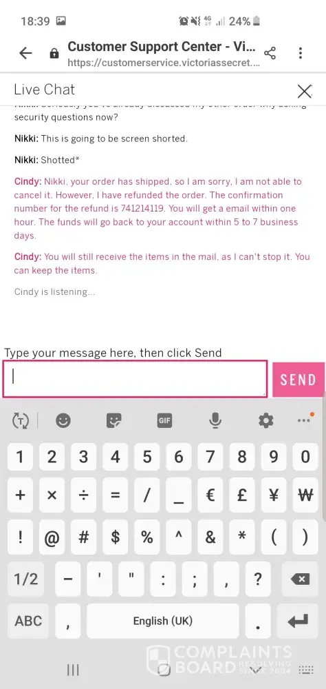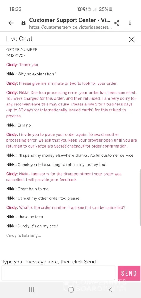 Where to even begin with this catalogues of monstrosities I do not know... I'll give it a good go. So i realised yesterday (11th) that my order had been cancelled 5 days before with no explanation or attempt at making the situation better. I engaged in a live chat with Ashley at 17:39 who told me there was no issue with my order and then failed to respond again with anything helpful, I can attach a screen shot of where the conversation was left. Not being satisfied with that I tried again at 18:33 and spoke to Cindy who instantly told me there had been a processing error and I was welcome to re-order. After I advised her I didn't wish to and I would like any outstanding orders cancelled she advised that she couldn't stop the orders and I would still receive them AND keep the items and that would be confirmed via email within an hour... Had a feeling it hadn't been done and no email still the following morning so I contacted the 0800 234 0481 number at 7am this morning and spoke to Kaitlin who after 7 minutes was no use what so ever and told me I was telling her the order number incorrectly so I asked to speak to her manager. Kaitlin had me on hold for ages and came back with no manager. Still arguing the order number wasn't valid and that she was discussing it with her supervisor, even though I specified a manager. Anyway after nearly 45 minutes Kaitlin finally provided me with an email address for me to send the screenshots to and she recieved them and STILL tried to pick fault which I'm sorry made her look a complete idiot. I even questioned her as to if she felt silly accusing me and she couldn't answer. An hour and 10 minutes in I FINALLY get the pleasure of speaking to Kaitlins supervisor who's name wasnt even worthy of remembering decided to hang up on me. I then rang the Bristol store I'd visited last Thursday to see if they could off any help and spoke to the sweetest young lady called Emily who couldn't apologise more if she tried bless her who informed me the top port of call was the number I'd already been hung up on or this email... so failing this I will be contacting the ombudsman as I've been made fully aware all calls recorded and I'm certain Victoria Secrets have failed me miserably. If some one would kindly contact me asap I'd be extremely grateful.Â