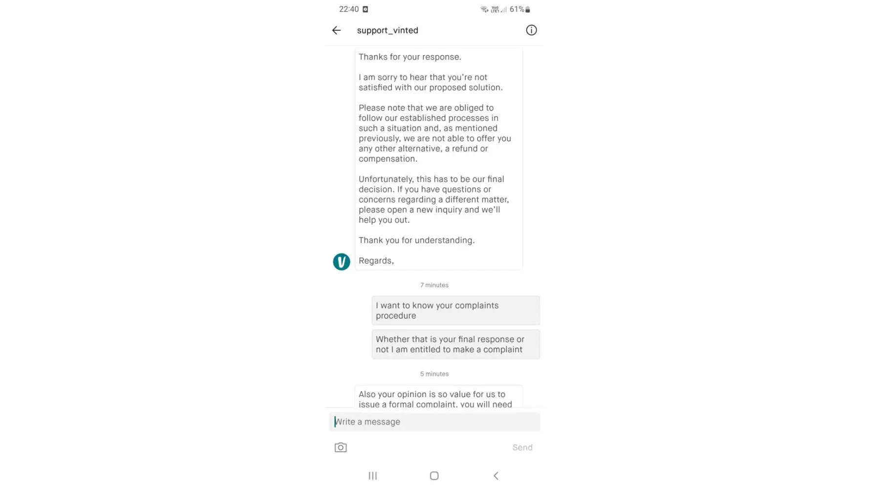 I have given Vinted a 24-hour ultimatum to provide a resolution. Unfortunately, to date, I have not received any satisfactory response or action from them. This lack of response only reinforces my belief in the urgency and gravity of this matter.