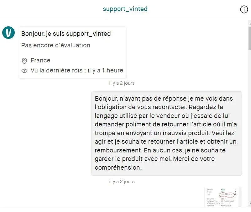 The seller was uncooperative and unresponsive throughout the return process. In spite of the compelling evidence of the item's condition and my repeated attempts to contact the seller, they failed to address the issue. This led to an escalation of my case within the system. It was my expectation that Vinted's buyer protection would work in my favor, as it is designed to ensure a safe and fair buying experience.