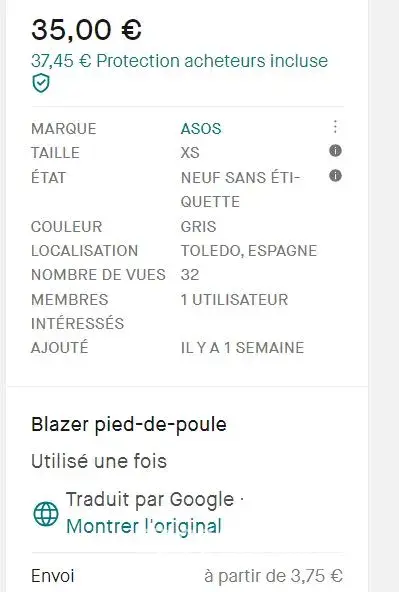 On October 4th, I purchased a "Blazer pata de gallo" from Vinted, which was advertised as "new without tag." Unfortunately, upon receiving the item, I discovered it to be an older product, falling into the "good" category, and it even had noticeable stains. Immediately after receiving the item, I promptly provided comprehensive evidence of the discrepancies to Vinted's customer service team.