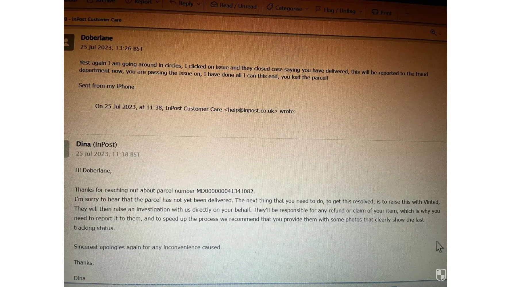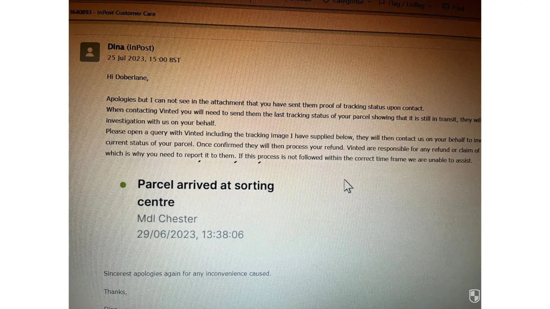 I opened up an issue dispute, providing Inpost MF000000041341082 evidence-in that my item had in fact been delivered to Inpost Mdl Chester sorting depot and not my Inpost designated Chesterfield Address, as Vinted has claimed. I complained to Vinted on numerous occasions since 20th July.