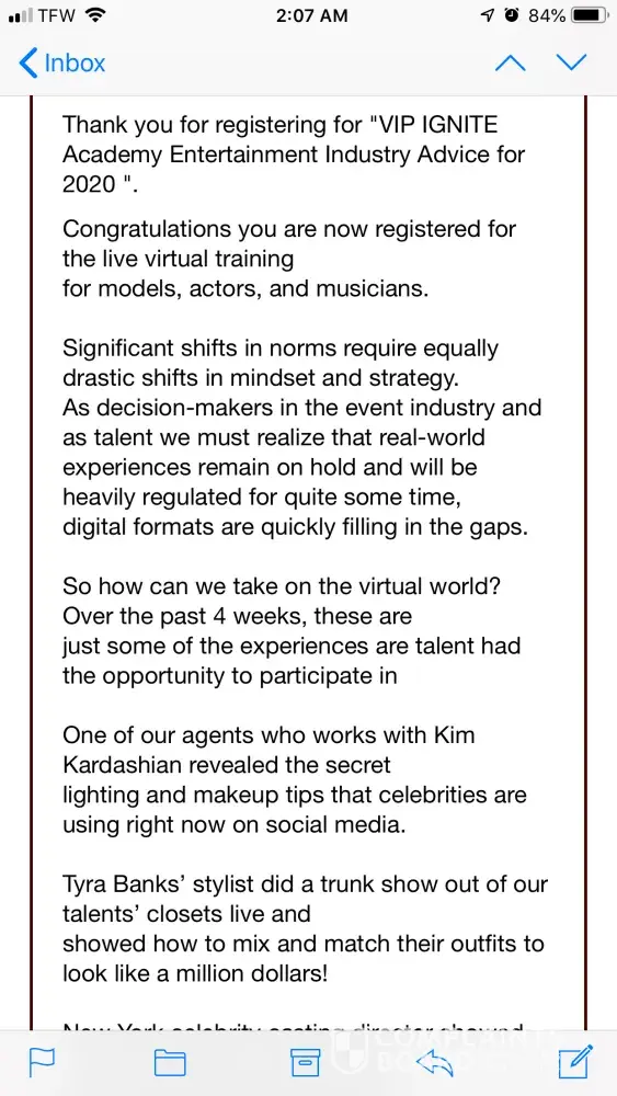 A couple months ago, I saw an ad on IG for a free intro zoom call to VIP Ignite, a program to help aspiring actors and models. As a hopeful actor, I was thrilled to have found a way to break into the industry and signed up for the call. The first red flag? The entire intro call dedicated to assuring us it's "not a scam." That should have been the end, but...