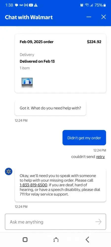 Purchased a laptop from vip outlet via walmart app... I never received my item as it delivered to some unknown address on my street. It was left by a blk folding chair and a picture was taken of it and posted. I walked up and down my street looking for where it was placed and was unsuccessful. I contacted walmart, who told me that they would contact the...