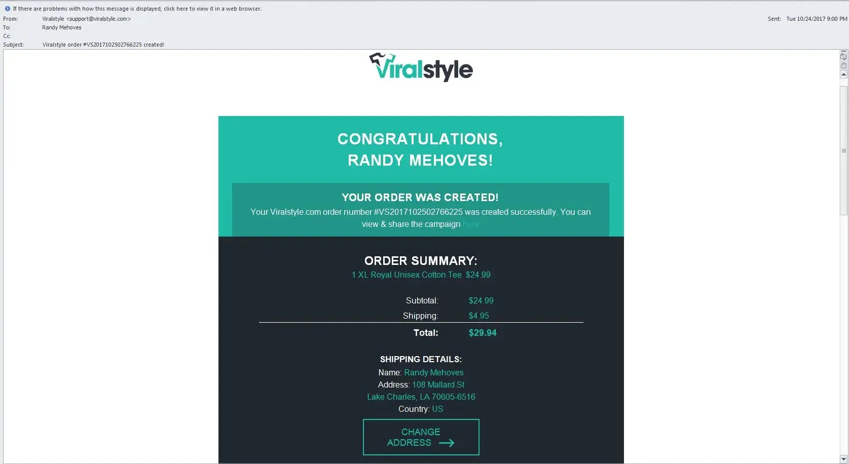 When I tried to get my money back for the original order that never went through they lied and told PayPal that they only received payment for the 2 shirts they sent. I appealed and showed PayPal the 3 payment confirmations through them and the 2 order confirmations from Viralstyle.