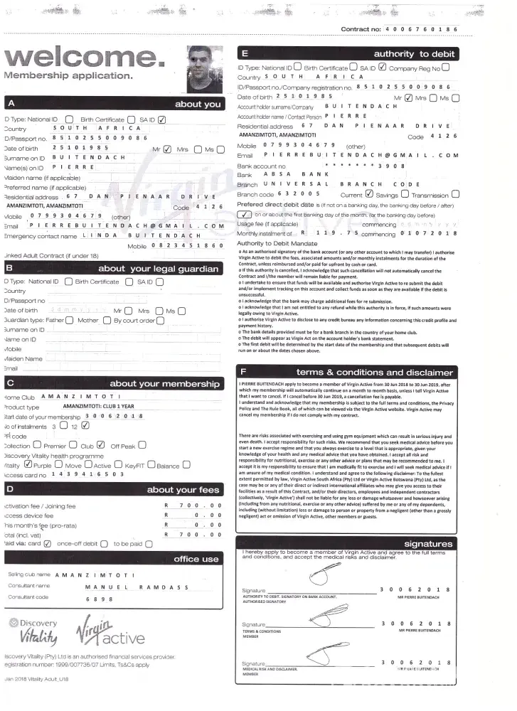 When to gym at westville Virgin Active and I was moving oversees so I asked the consultant to please help me cancel the account and I filled in all documents presented to me. Now after 3 years I've gone to a club to start gym to find that they haven't closed the account and i have to pay R3700 + R 799 to join the gym. I have phoned the club and they didn't want to take responsibility for not submitting the documents and i have phone Head Office that told me that I need the document?! And I spent more then 45 min on the phone with them with no help.