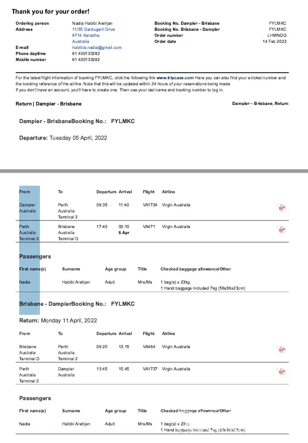3- to rebook the flight for my aunt Ida Piovesan and Chris Adams for the 21/10/2022 - Perth - Sydney.
