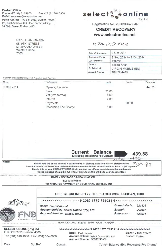 because I saw their monthly charges comes to R50.60. Every month when I emailed deposit slip I would asked for a statement which they just ignored. Eventually this month I asked them to stop ignoring me and provide a statement as I want to see what the settlement amount would be and they phoned me to say they were not ignoring me but the settlement amount was too much for me to settle, so I asked what was it and she said something like R1300.00 I was so in shock I forgot the precise amount . I asked her how is that possible, if I have paid R750.00 to date, the initial cellphone contract was for the amount of R1379.04 which I have paid completely, yet here they are expecting me to pay a whole lot more extra than the initial price on an error they made and all this for a cheap overpriced cellphone. and how did they get from R122 to 439.88 to more than R2000.
