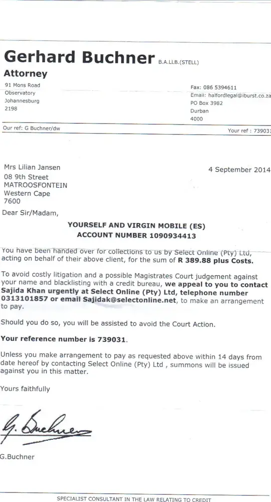 My cellphone contract was fully paid up so I phoned Virgin on the 20th August, spoke to "Happy" to forward a statement to me to verify that and he informed me that I can only get a statement in October because I needed to notify them one month prior to date. I disputed this and contacted "Hello Peter" to establish if this is even legal. Why should the client notify them when a contract is legally finished, they should phone client to enquire if the client wishes to continue, I really think the consumer board should make that an issue with all cellphone companies. Long story short, they handed me over to a collection agency, who handed me over to an attorney. The payment I made per month was R122.00. The attorney's letter dated 4/9/2014 said I have been handed over for the amount of R389.00 plus costs. Where does one month extra come to that amount. Then I received a statement from collection agency dated 9/10/2014 which shows outstanding amount as R439.88 which obviously included their costs.