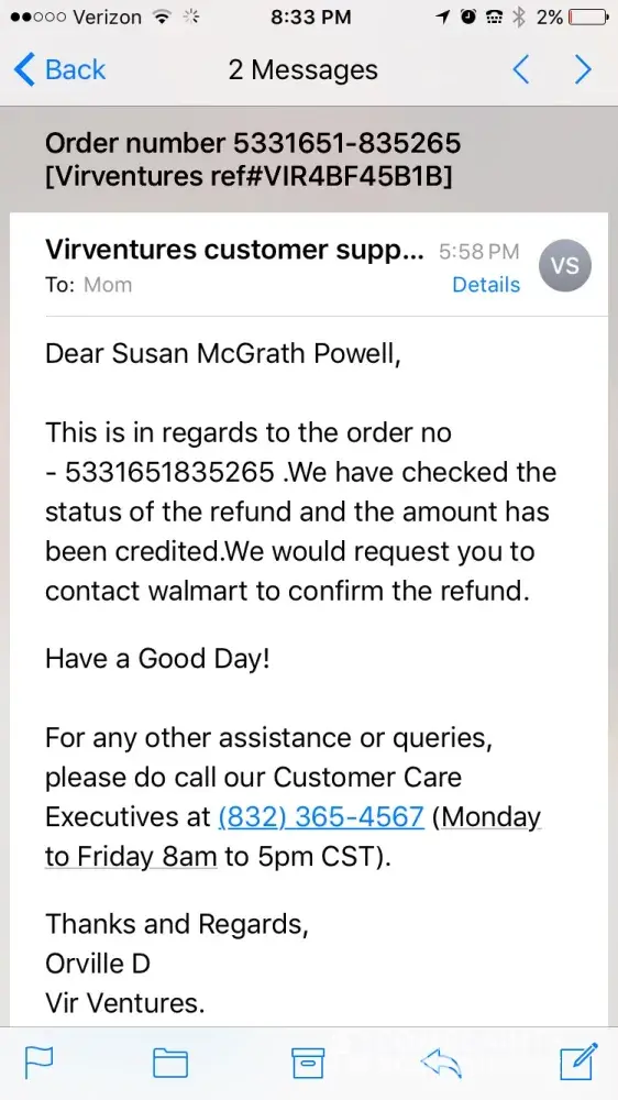 Ordered a pet gate through Walmart that was fulfilled by Virventures. The gate did not fit. Called Virventures eventually got A RA number 3023111 and returned the gate. They claim they refunded my costs yet there's no refund to my account nor have I received a check from them.