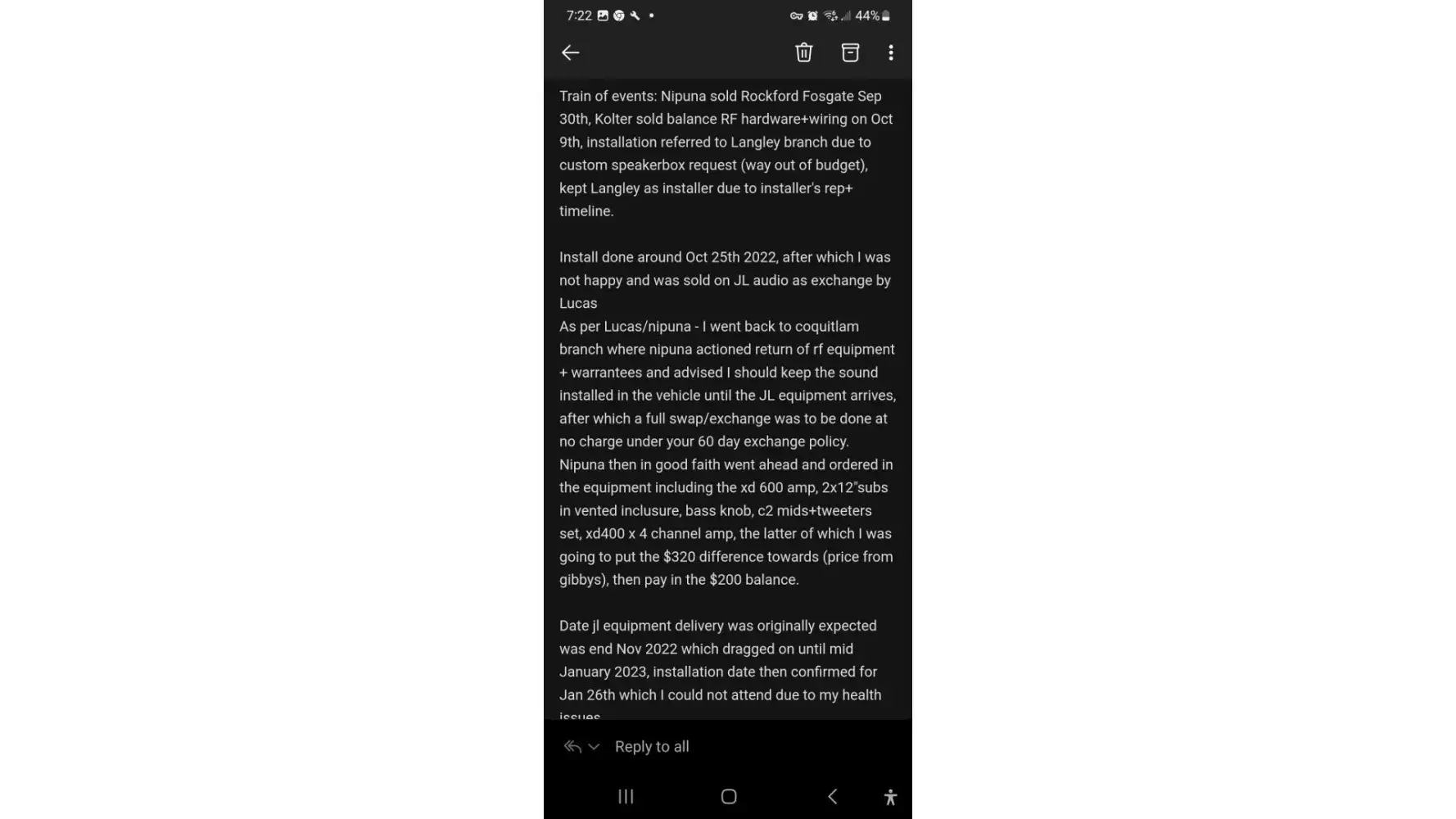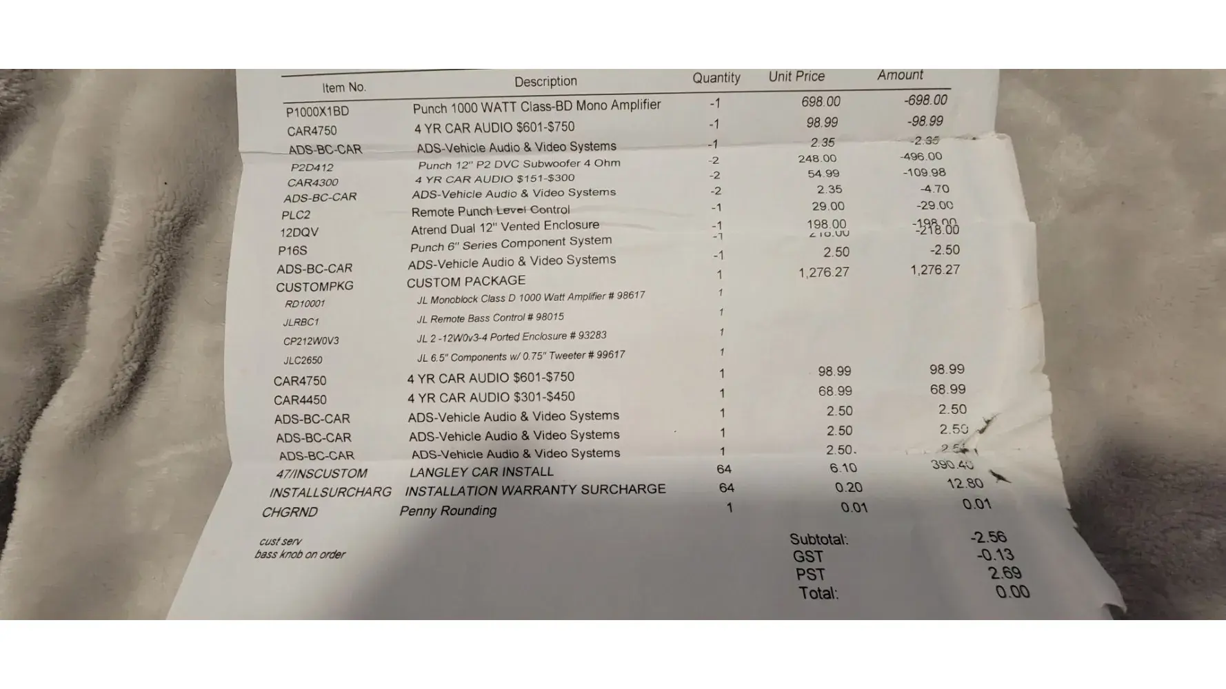 Car audio, defective product being sold as new and insurance being added fraudulently without consent
