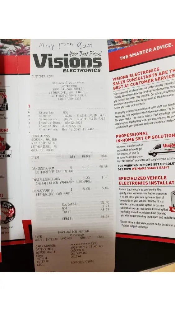 I purchased products from the red deer store I had them install it. Discovered my subs stopped working so I looked into and the amp they glued onto the back wall of truck was no longer glued up. It was sitting on the cords on the floor and obviously for some time as the rca ports on the amp are not working now. I took to place of I stall and the installer...