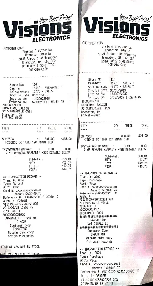 I am writing today to complain of the poor service I received from your branch 9145 Airport Road Brampton on May 18, 2019. I was visited there for to buy Sharp 50" UHD 120 AquoMotion smart LED TV. I initially talked to one of the sales representatives and clearly said I want Sharp 50 Inch TV because I saw that TV is in promotion on your website. She...