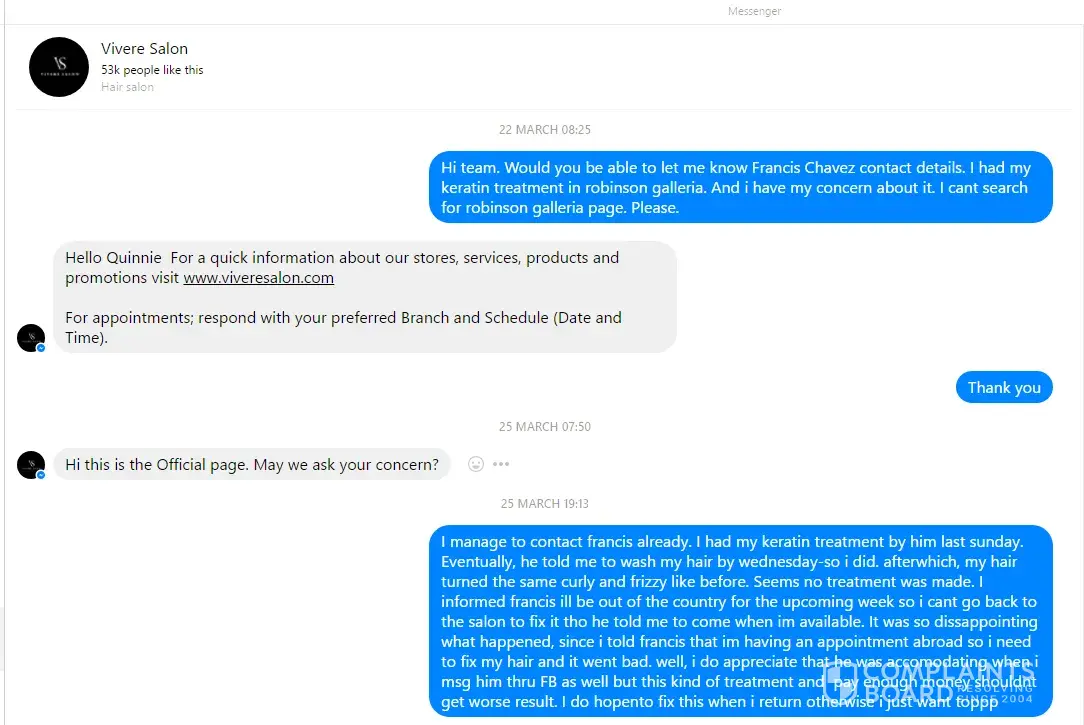 Read full complaint and 18 commentsVivere Salon complaints: history and resolution overview