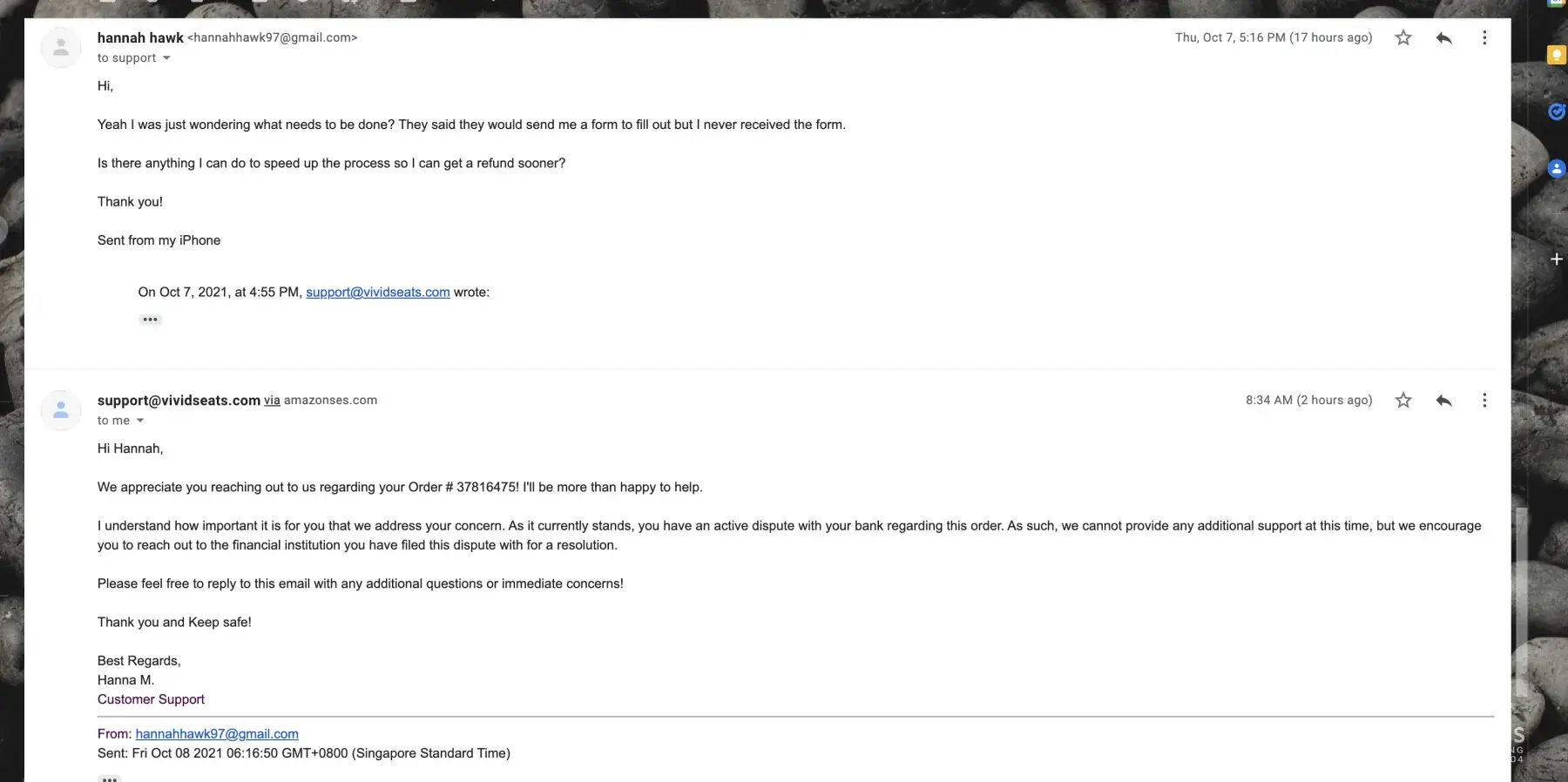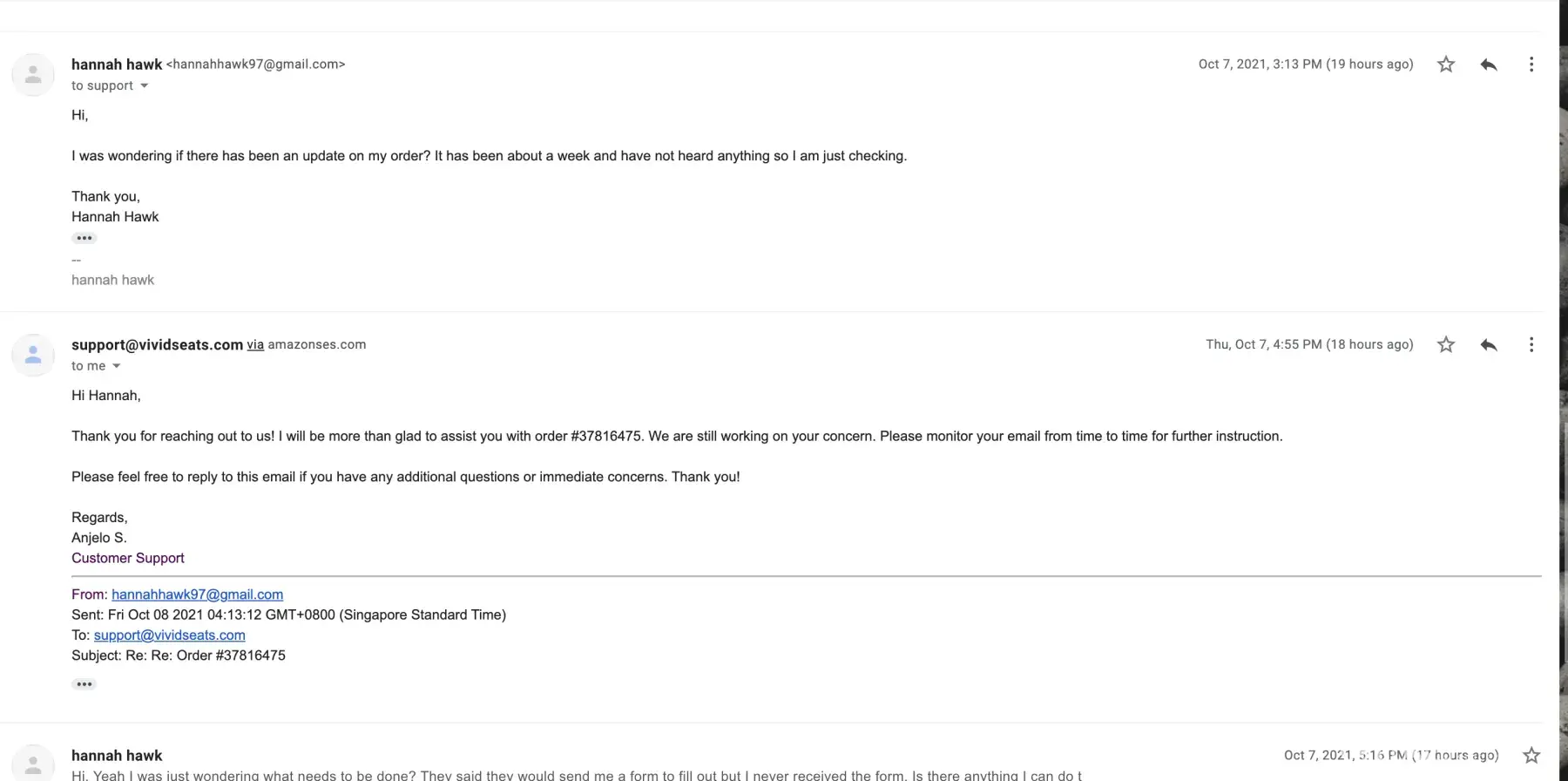 I had ordered tickets for a sporting event. It was the day of the event and my tickets were still not available on my account. I sat on the phone and chat with Vivid Seats customer service for 4+ hours on the day of the event. The tickets were still never delivered to me. I reached out to support the night of the event (after the event was over) asking for a refund, following their "100% Buyer Guarantee" policy, and still never received a refund and it has been over a week now. Every email I sent, they would reply saying "it is still being investigated." They said they would send me a form to fill out, they never sent the form (no surprise) and then told me it (again) has to be investigated. I finally decided to dispute the charge on my credit card so now my credit card company has been reaching out to them to figure out the issue (even though it is a simple and obvious issue).