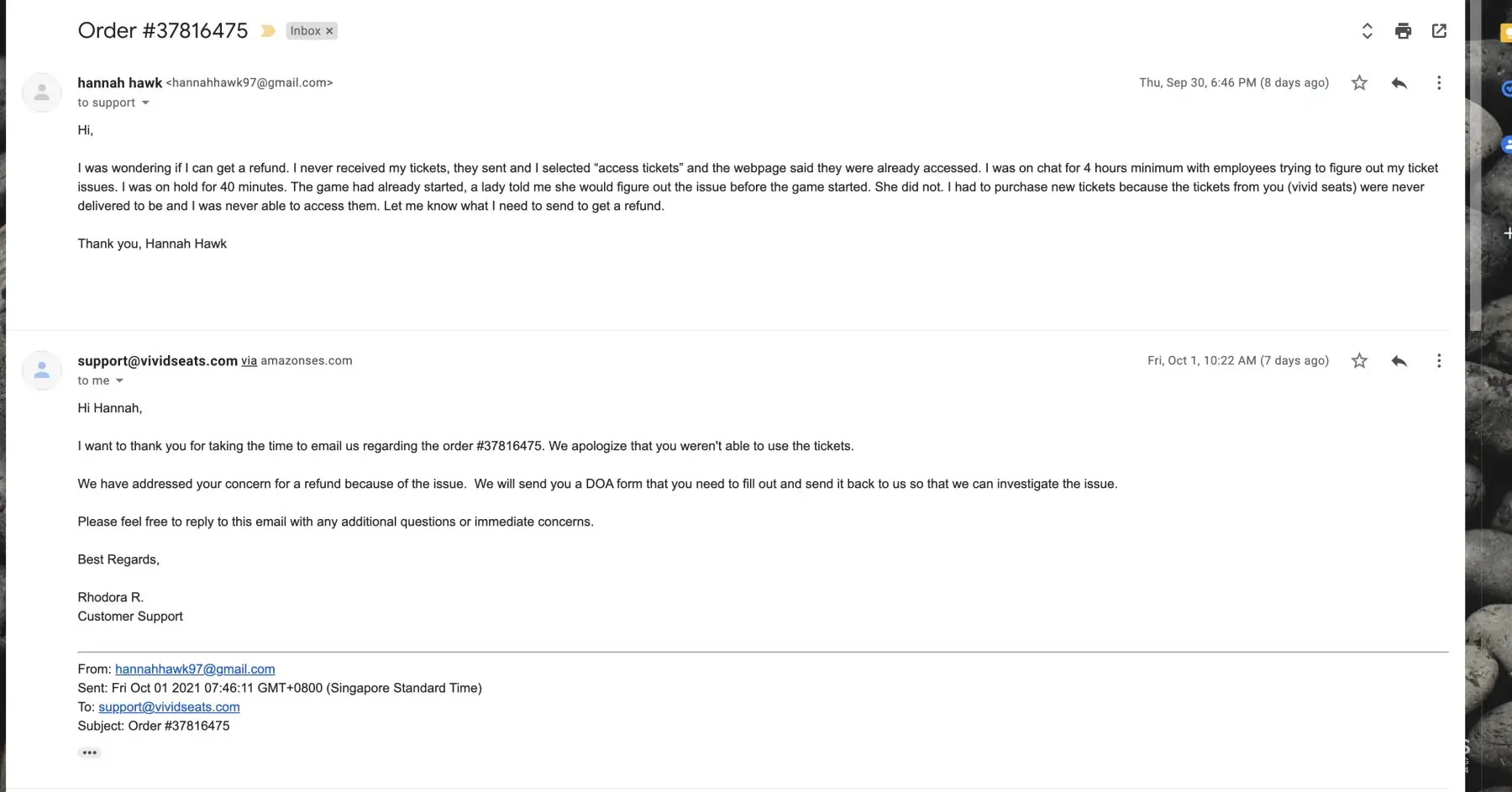 Ordered tickets for new orleans saints nfl game against dallas cowboys on may 26, 2021 and received a text stating that the seller has transferred the tickets to my email on 6/1/2021 which I never received the e mail so that the tickets could be transferred to my account. Have reached out to customber service at least 10 times and been getting the run around they said they would get the seller to retransfer my tickets and that have not happened so far but they was paid on the 5/27/21. Would like to hear from vivid seats to make sure that I will receive tickets before the game, or have them retransfer the tickets so I can have a piece of mind
