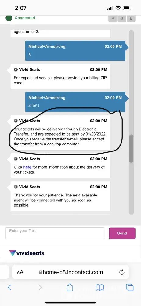 I ordered hockey tickets for Colorado Avalanche vs Detroit Red Wings. Hours before the game I contacted Vivid Seats because I never received my tickets. They sent me one email (spam folder) for my parking pass. The Customer Service agent at the venue looked up my seats and said nothing was ever transferred. I am out $586.00. Vivid Seats customer service is "chat" or email. I did receive a text message from them and I googled the phone number and was told it is an invalid number. Total scam.