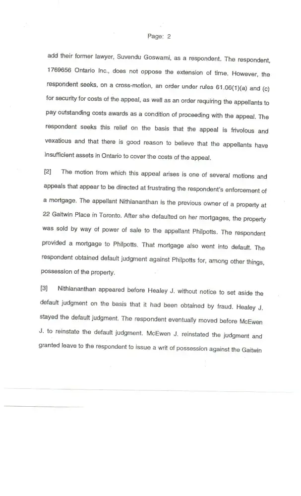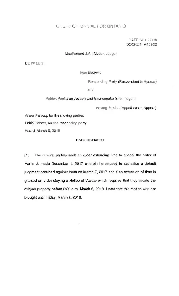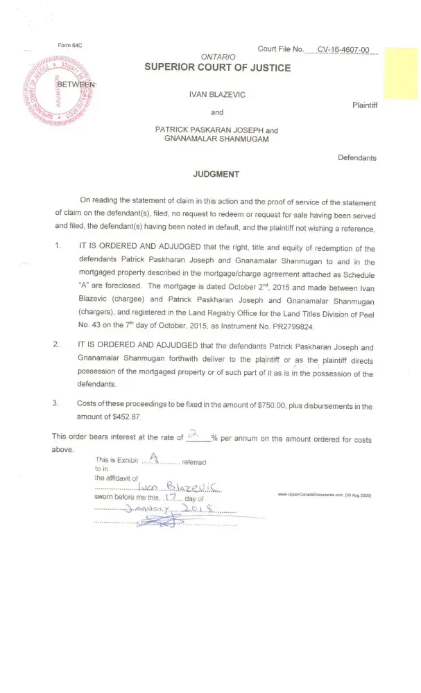 Who came to borrow the money from Mr.Thiru’s Investor? Patrick Paskaran Joseph, NOT OTHER WAY AROUND. The Lender gave $100, 000.00 as a second mortgage, the borrower’s received the 2nd mortgage advance money through the borrowers lawyers, with one-year open term at 12% was advance on October 02/2015; Patrick Paskaran Joseph gave his personal cheques for the mortgage payment, most of them returned as NSF (No sufficient funds in the account), the borrowers only paid 4months payment. After several collection calls and meetings with Mr.Patrick. After 6months of Non-payment of mortgage, Lender’s lawyer proceeded with a legal action. These people haven’t followed the Canadian mortgage contract law and pay their mortgage loan as per the loan agreement and charge; Lender has followed the Canadian legal system & the law and obtained a Judgment on March 07/2017. The borrowers and their lawyer defended this action, both Patrick Paskaran Joseph and Gnanamalar Shanmugam lied & testified at the Court. The borrowers appealed to the Superior Court and lost the case on March 05/2018. The Lender and Mr. Thiru have been very patient over 2years. The Owner has not paid property taxes, condo fees and kept the property full of garbage. It took 4 people to clean up for the whole day. Now, they have possession of the property jointly with Scotiabank and the subject property will be sold to recover lender’s money. Already, many people have seen it and putting an offer. The borrowers appeal to the Superior Court and lost the case on March 05/2018. As per lender’s lawyers investigation, on April 18th/2018 these both borrowers have filed Bankruptcy on or above 2017 to intentionally fraud the lenders of the subject property. It is very clear these borrower had a plan to defraud the lender, but Mr. Thiru, lender and lenders lawyer STOP this criminal act. It took us over 2 year of Non-payment. See the attached documents, you must encourage everyone to Not to miss a mortgage payment.