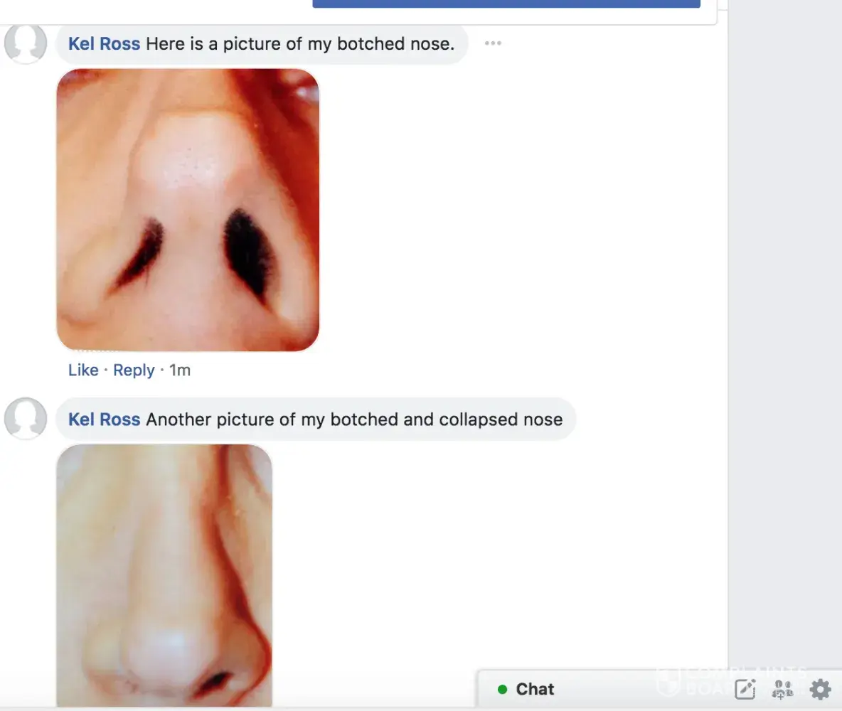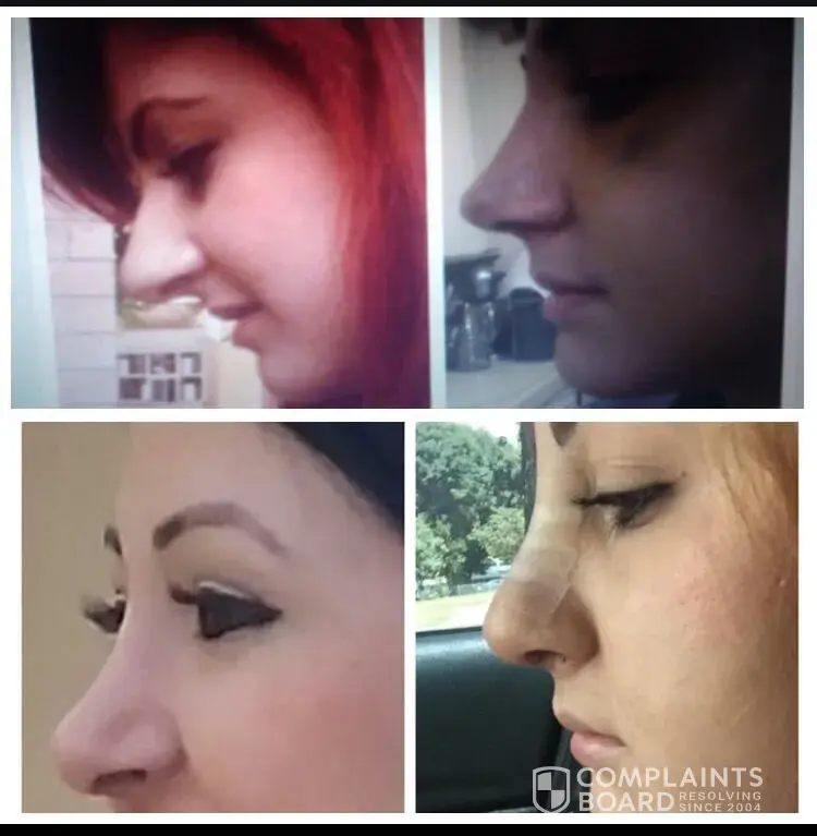 The patient in the first picture had her nose collapsed completely and had to undergo multiple surgeries. Vladimir Grigoryants caused permanent disability on this patient by damaging her nerves. The patient is unable to breathe , suffers from dry nose, lack of mucus production, nerve pain, post nasal drip and had to undergo multiple reconstructive surgeries which failed to correct the damage that Vladimir Grigoryants caused. In addition, Vladimir Grigoryants falsified this patients operative report and violated her HIPPA right.