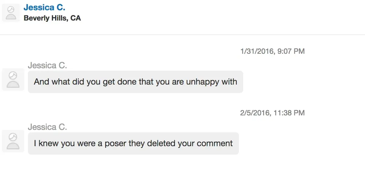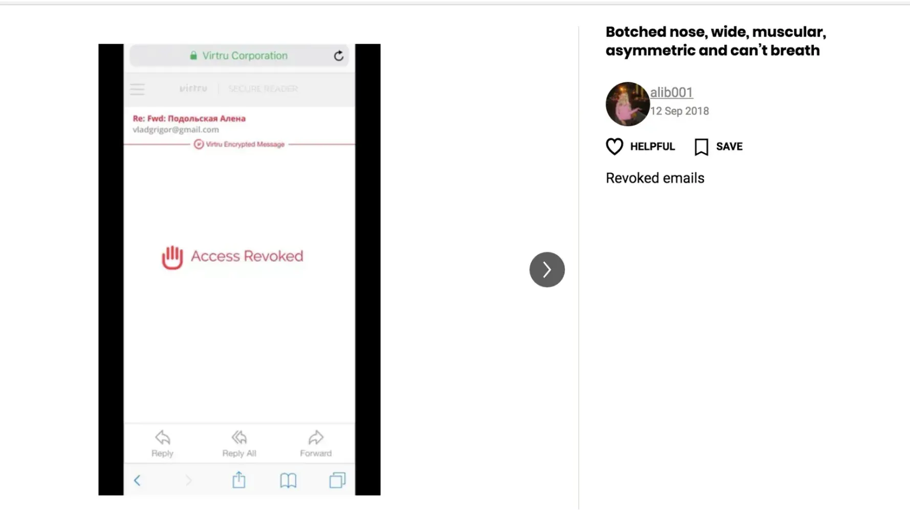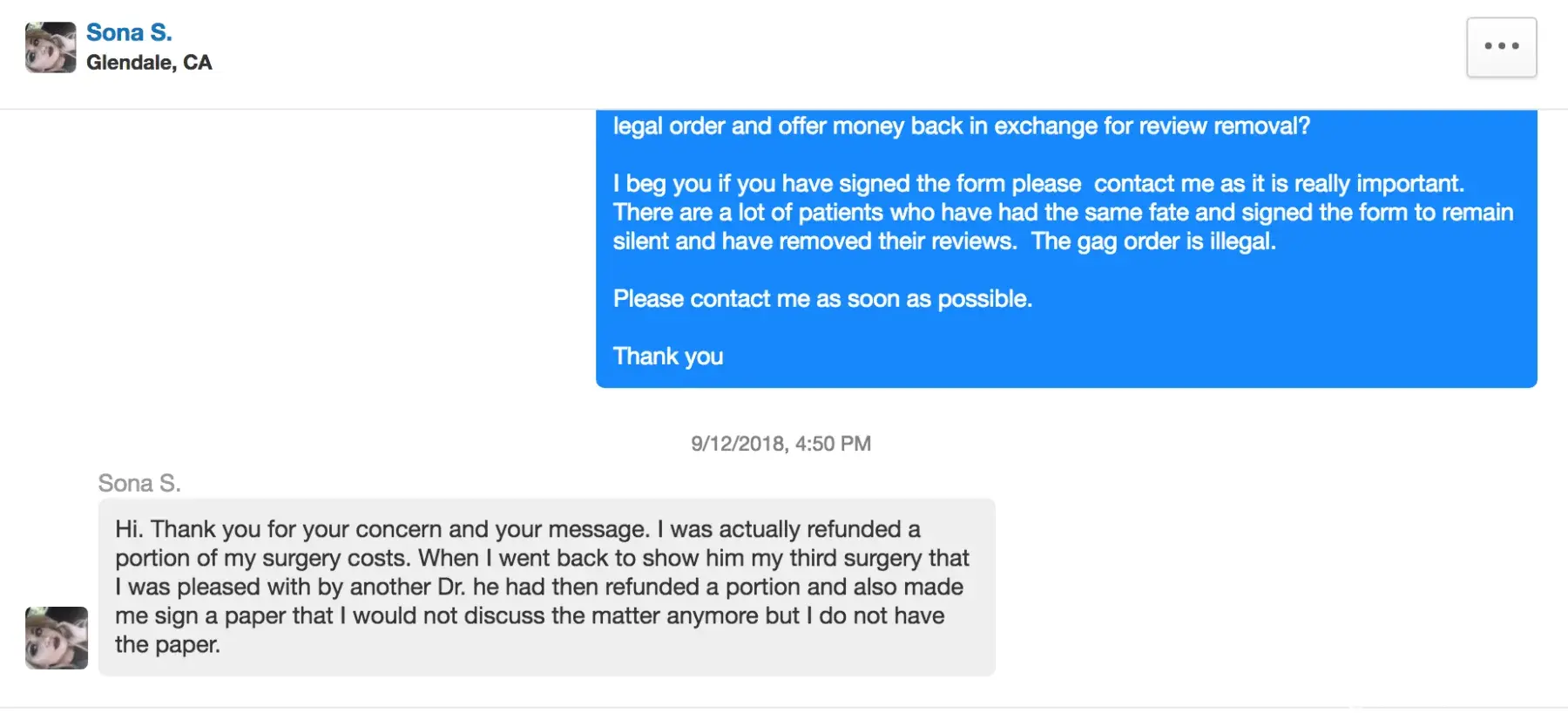 He then asked the patient in the middle picture to remove her negative review and he will issue a partial refund. After the patient removed her review, he told her he will not be refunding her. He uses a virtru email exchange. This allows him to revoke emails. In addition, it is said that a website called Makemeheal caught him for posting his own reviews on its site.