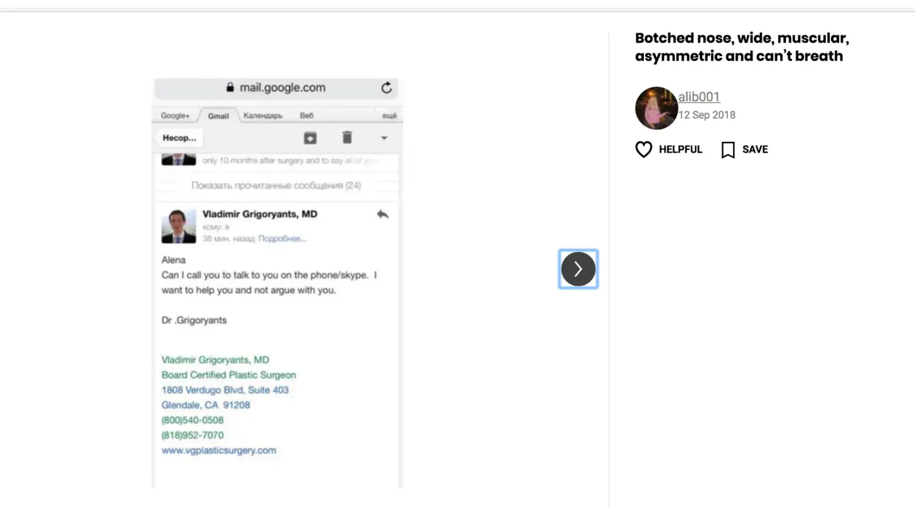 Pictures of botched noses of Vladimir Grigoryants. Unfortunately, it is not without a reason that when someone types the name Dr. Vladimir Grigoryants the top search terms are botch, Malpractice and lawsuit. There is a lot of pertinent information that you will not be able to find because it has been deleted. Plastic surgery is a risky procedure that can cost a lot of money. Do your thorough research and do not trust the reviews alone. Especially the ones with advertising content such as choose him, I highly recommend him, he changed my life, he is a miracle worker. In this day and age many people are making use of influencer marketing in exchange for free procedures, reviews. Spend your money on a skilled, knowledgable doctor with good etiquette and moral valuables.