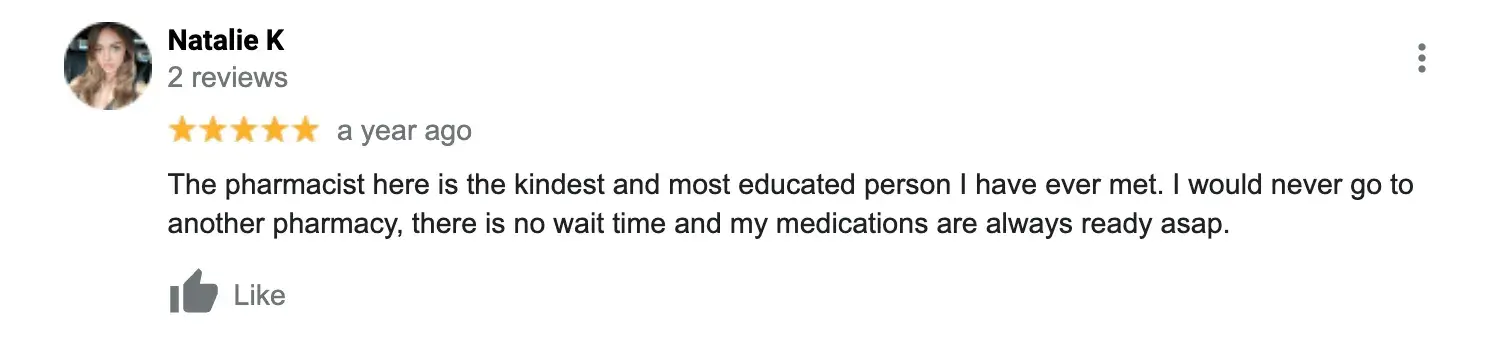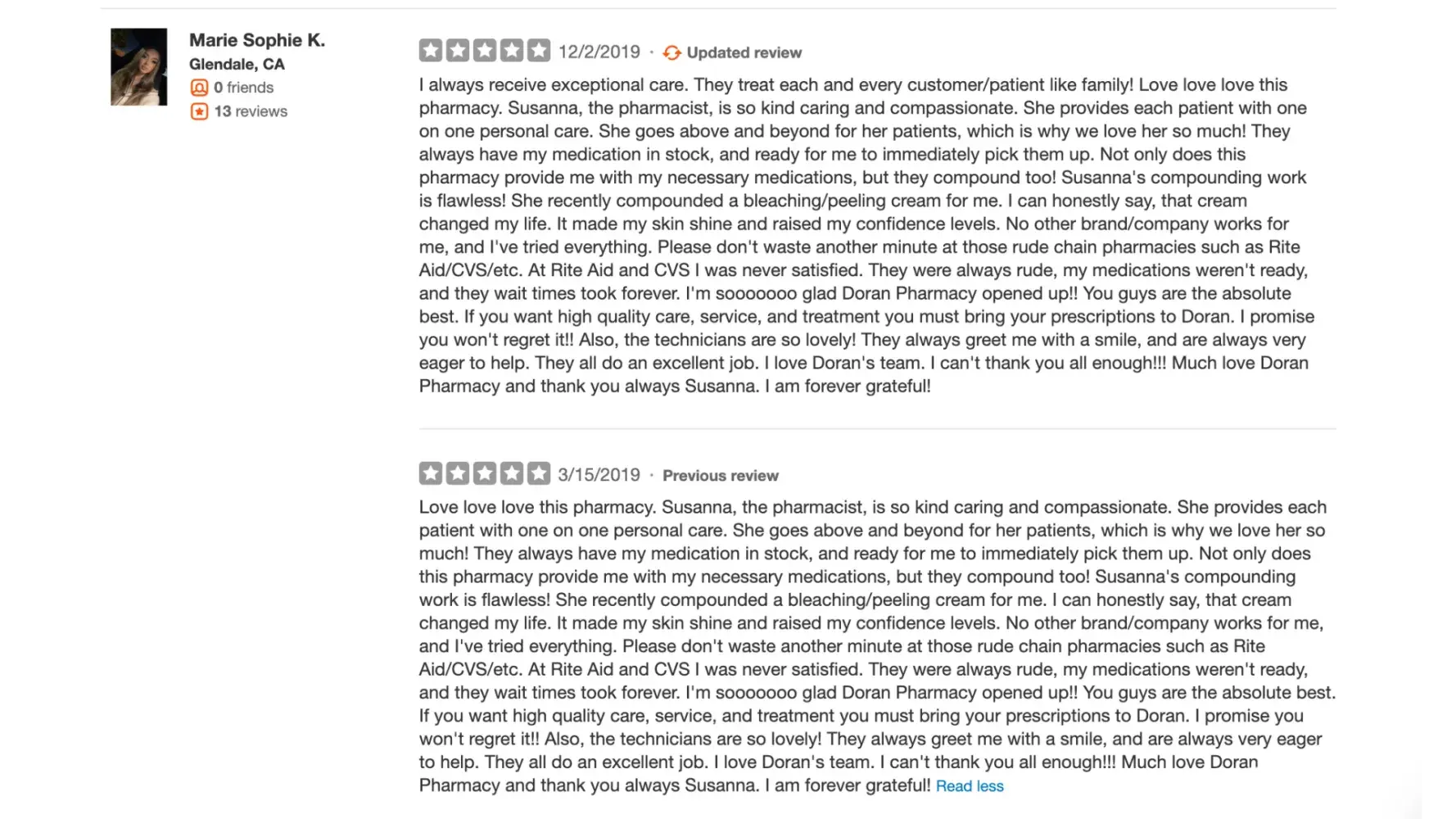 Doran Pharmacy is Vladimir Grigoryant's sister's pharmacy. Take a look at the review written by the business owners daughters where they bash other similar business and write a 5 star review for their own business. Marie Sophie K. is Susanna Kehishyan's daughter and she has written a 5 star review for their business which is against Yelps TOS.