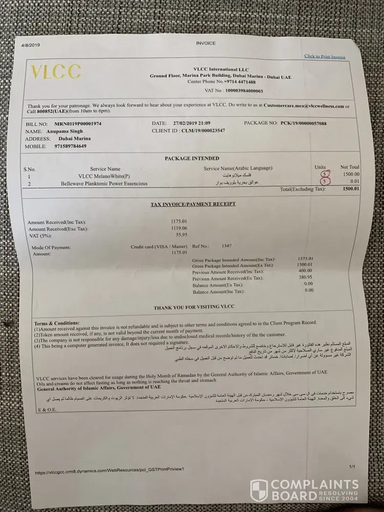 When I confronted them and asked for my receipt they told me they'll search and talk to people and then message me. I didn't receive any reply or message. VLCC doesn't have any customer care service so I've taken the mail address from Google and I'm asking to resolve the matter.