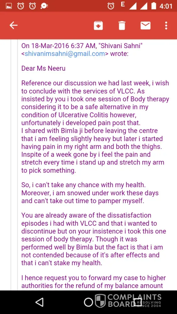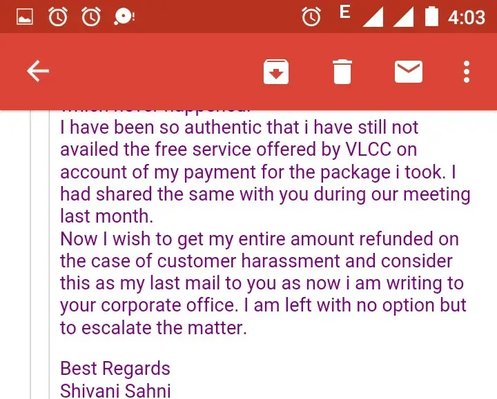 I was shocked about their communication gap leading to my ill health. Since then I have written multiple mails to Ms Neeru and customer care of VLCC and had spoken to Ms Shweta, Area Head who too called me atleast after 7-8 days of my mail and word with customer care representative. The last she asked me to meet their doctor with all my reports so as to get another alternative therapy and that they will not refund my money. My question is having suffered twice and staying at the mercy of VLCC's employees to offer proper services, why should I stake my health further?