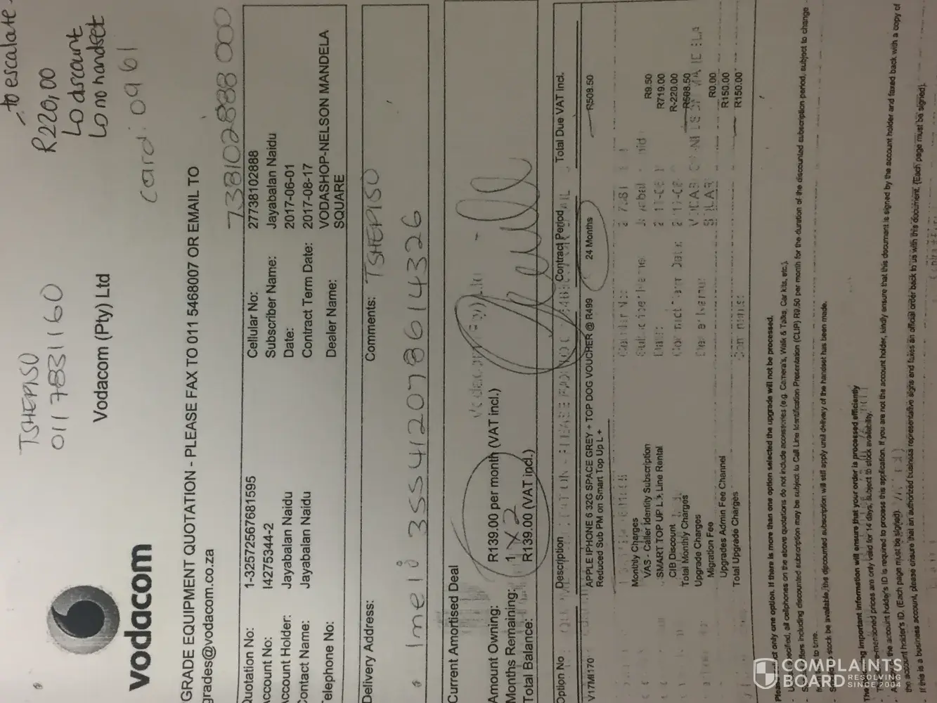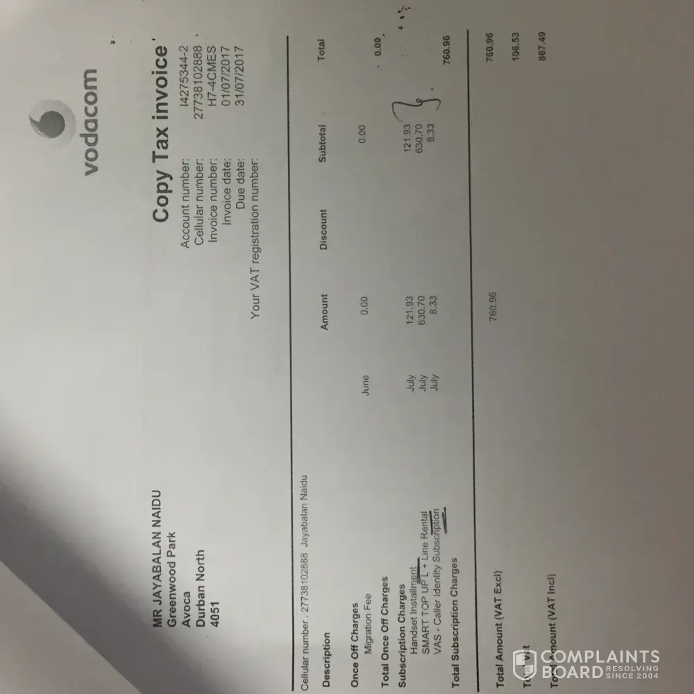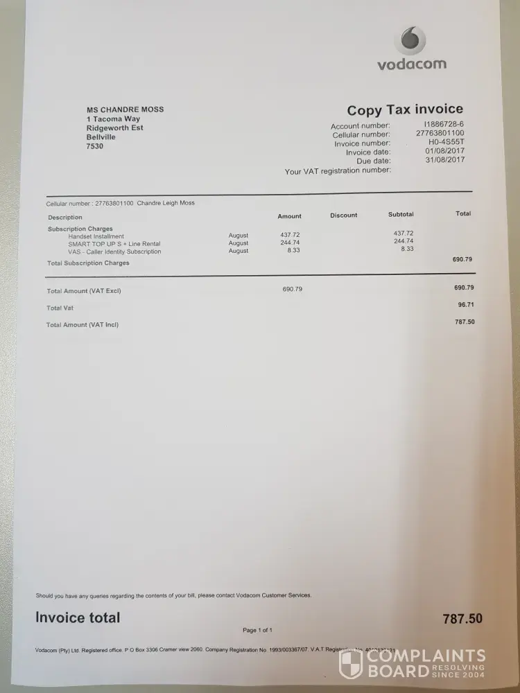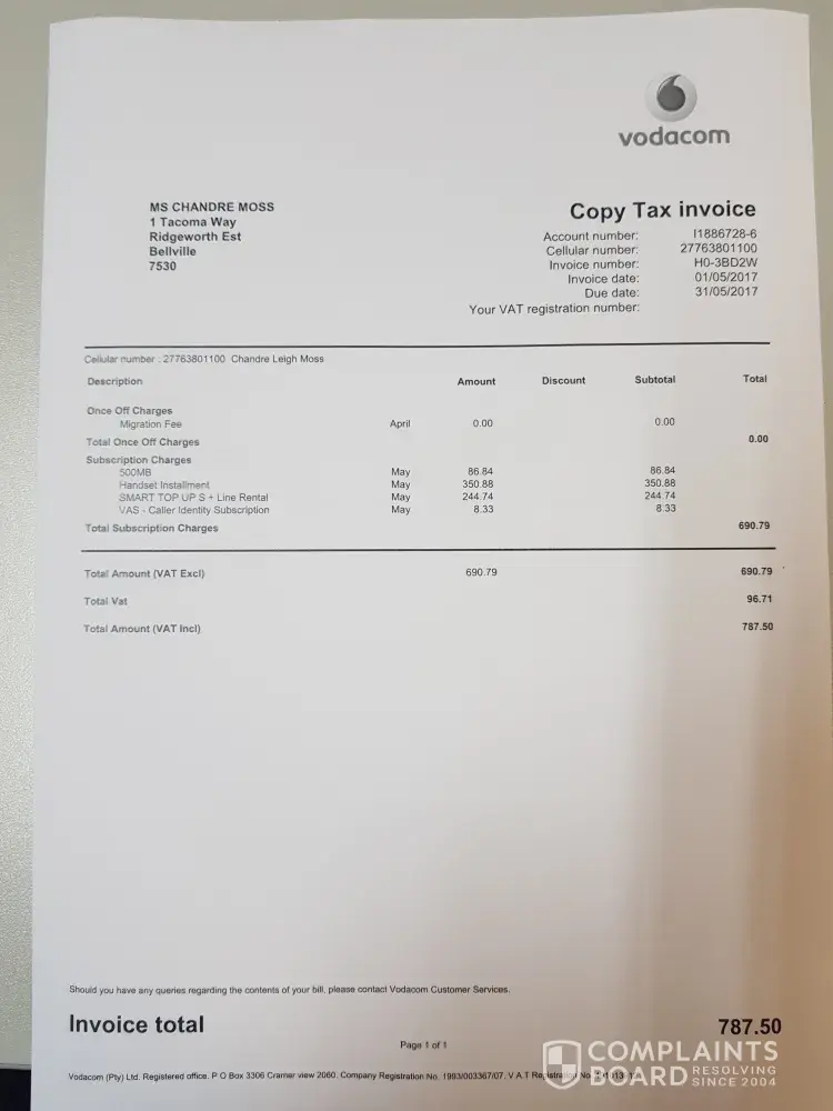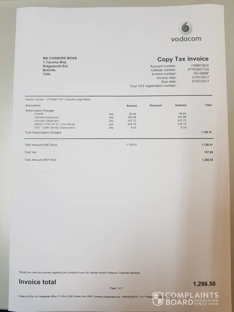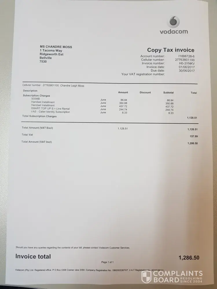However, upon receiving my first invoice from Vodacom after upgrading (June 2017) I was billed R499 (R1286.50) more than what I signed for. Also my address and surname was not changed on my account.