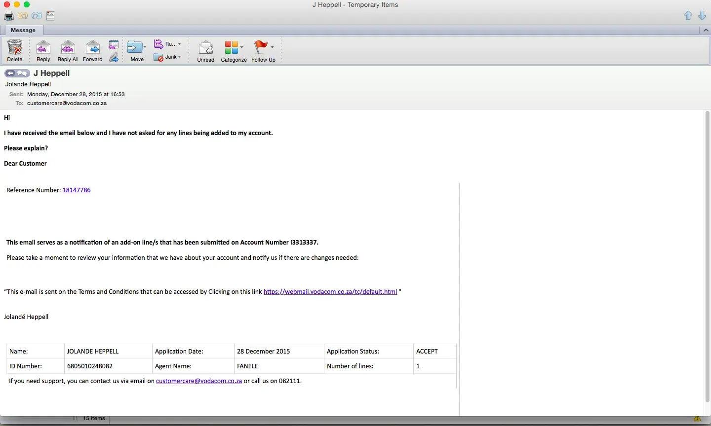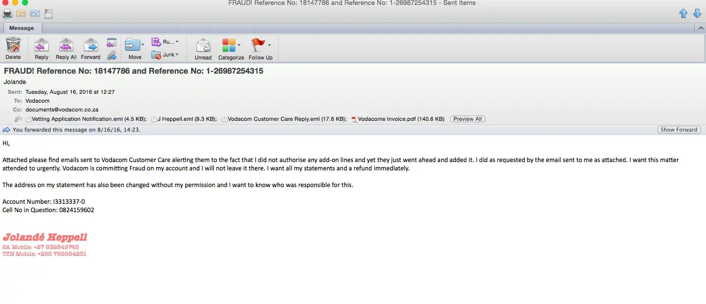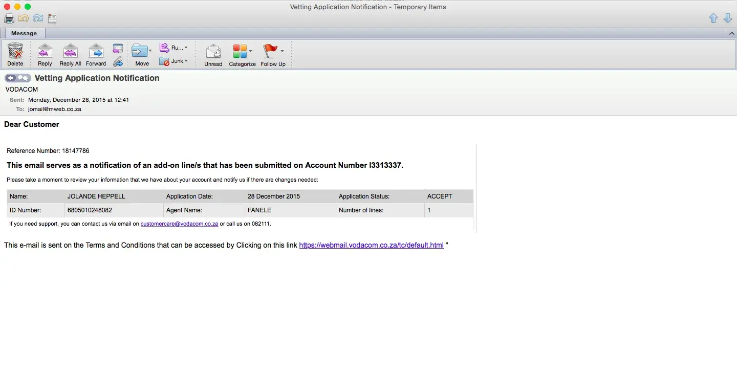 the next day, Monday (05/09/2016) I went to the nearest Vodacom outlet, where the lady "helped" me. She provided me with a reference number, and emailed the proof (letter that is signed by account holder) that I may proceed with any matters/ queries with the account.