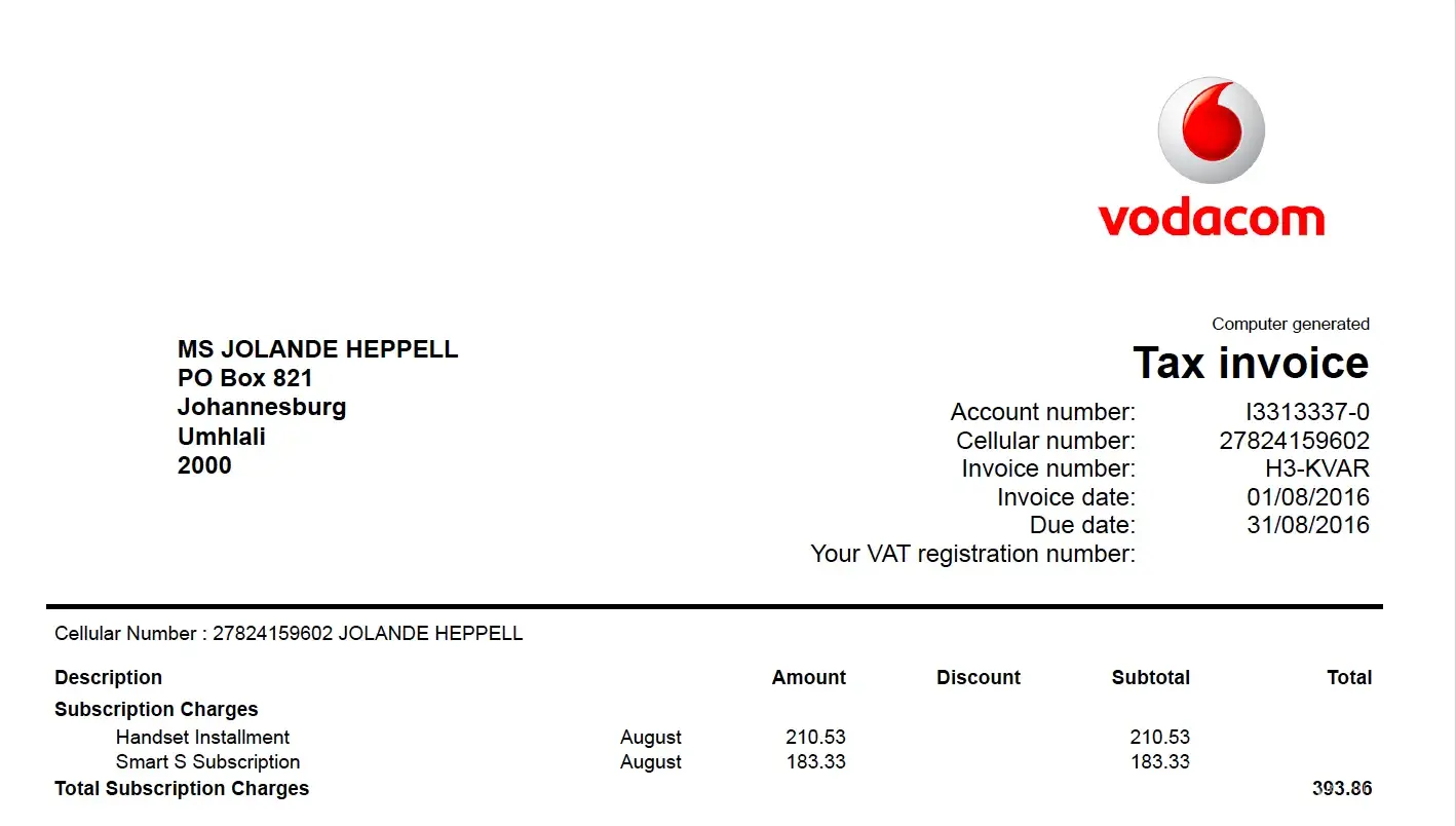 My datalyn kon ek nie gebruik vanaf 11 Junie 2016. Ek het Vodacom 12 Junie geskakel en hulle sê toe my lyn is geblok ek moet ‘n simswap doen wat my R67 gekos het. Ek het dit die 13de gedoen maar my lyn was nog geblok, hulle sê toe my rekening is oor die R13, 000.00 daar is bedrog op my lyn. Die einde van Junie was my rekening oor die R89000.00. Ek moes toe ‘n verklaring by die polisie aflê en met my ID vir hulle stuur. Ek het my rekening geblok en steeds het iemand toegang tot my rekening gehad. My rekening was die einde van Julie R12358.43