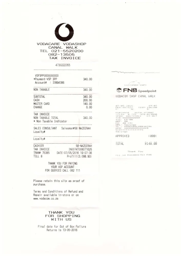 on Saturday (07/05/2016 @ 19:07:36) i mad payment of R340 (R200 cash and R140 on my card)